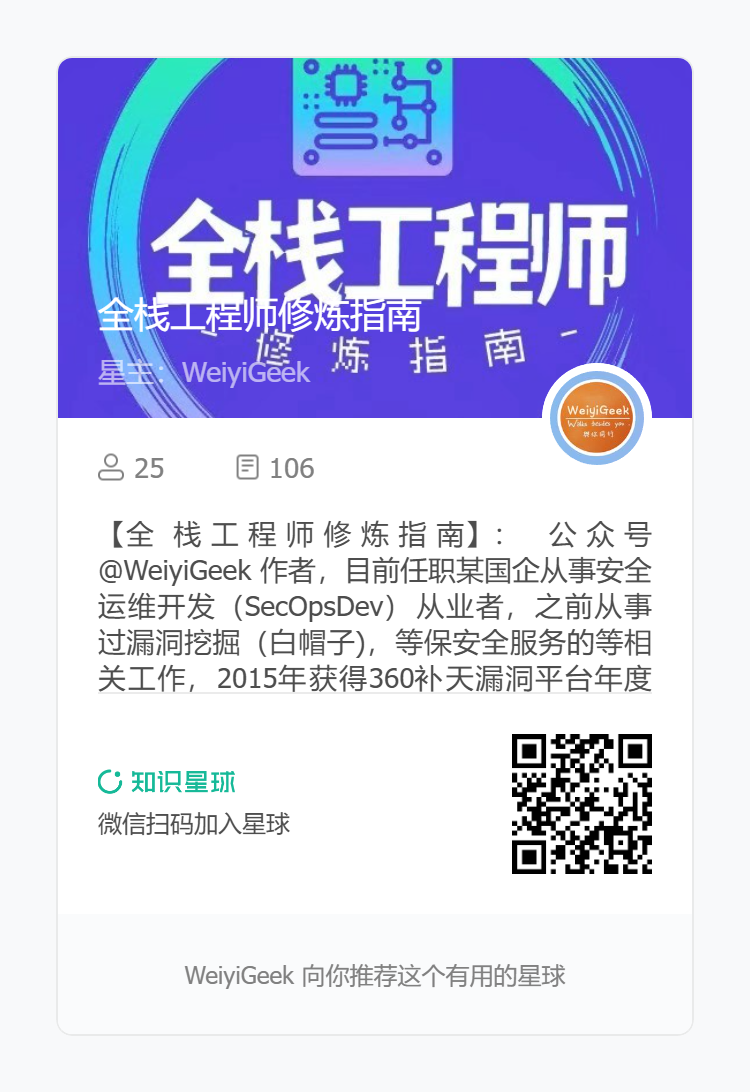 『 全栈工程师修炼指南』星球,主要涉及全栈工程师(Full Stack Development)实践文章,持续更新包括但不限于企业SecDevOps和网络安全等保合规、安全渗透测试、编程开发、云原生(Cloud Native)、物联网工业控制(IOT)、人工智能Ai,从业书籍笔记,人生职场认识等方面资料或文章。