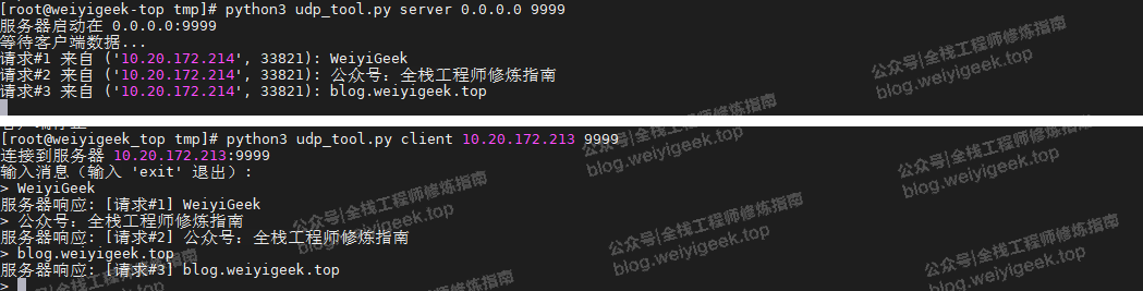 步骤 02.在 213 主机中执行 python3 udp_tool.py server 0.0.0.0 9999,在 214 主机(Nginx 代理服务器)上执行 python3 udp_tool.py client 10.20.172.213 9999,测试脚本,运行效果如图下所示。