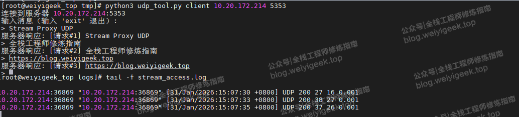 步骤 03.在 Nginx 中配置 UDP 四层反向代理,并测试 proxy_requests、proxy_responses 效果。