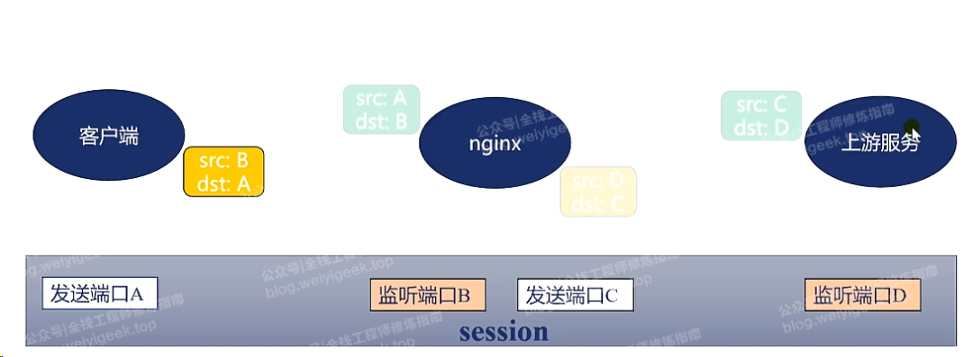 它使用 session 机制,当客户端发送报文时使用源端口 (Source Port),该端口用于接收服务器响应,源端口与目标端口构成一个会话,而 Nginx 作为反向代理需维护此 session 信息以正确转发响应,另外同一 session 中 Nginx 始终使用同一个端口(如 C)连接到上游服务,大致流程如下: