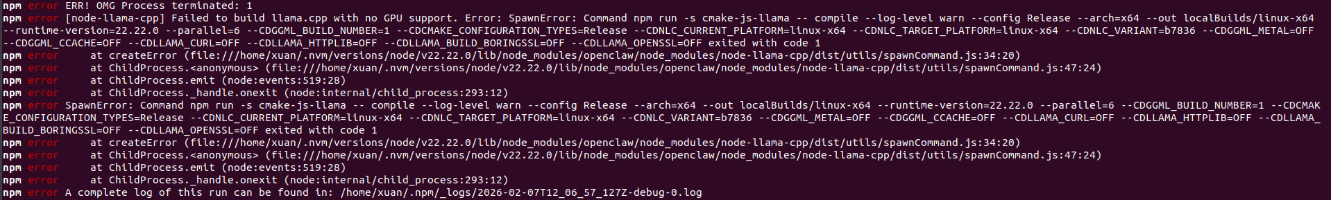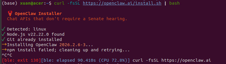 → Installing OpenClaw 2026.2.6-3...→ npm install failed; cleaning up and retrying..