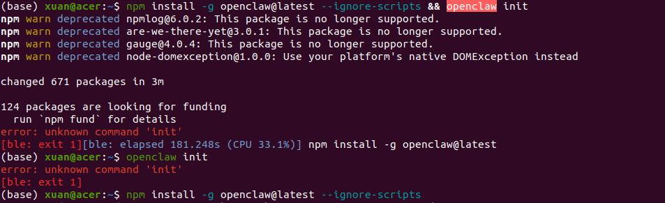 npm install -g openclaw@latest --ignore-scripts && openclaw init