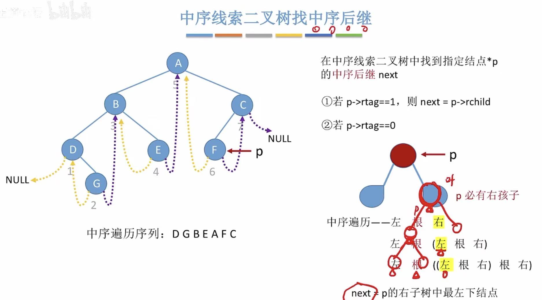 - 没有后继线索的,后继是当前结点的右子树中最左下结点