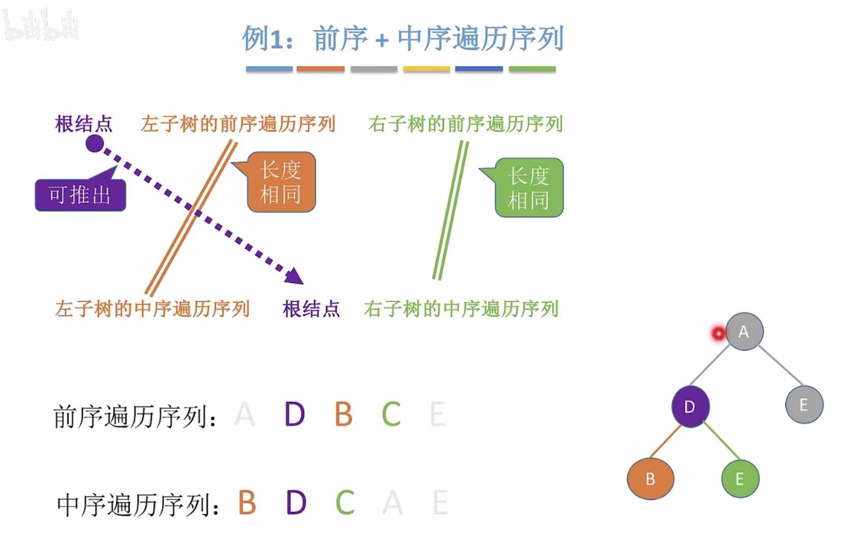 - 中序 :BDC A E-->BDC是左子树,E是右子树。