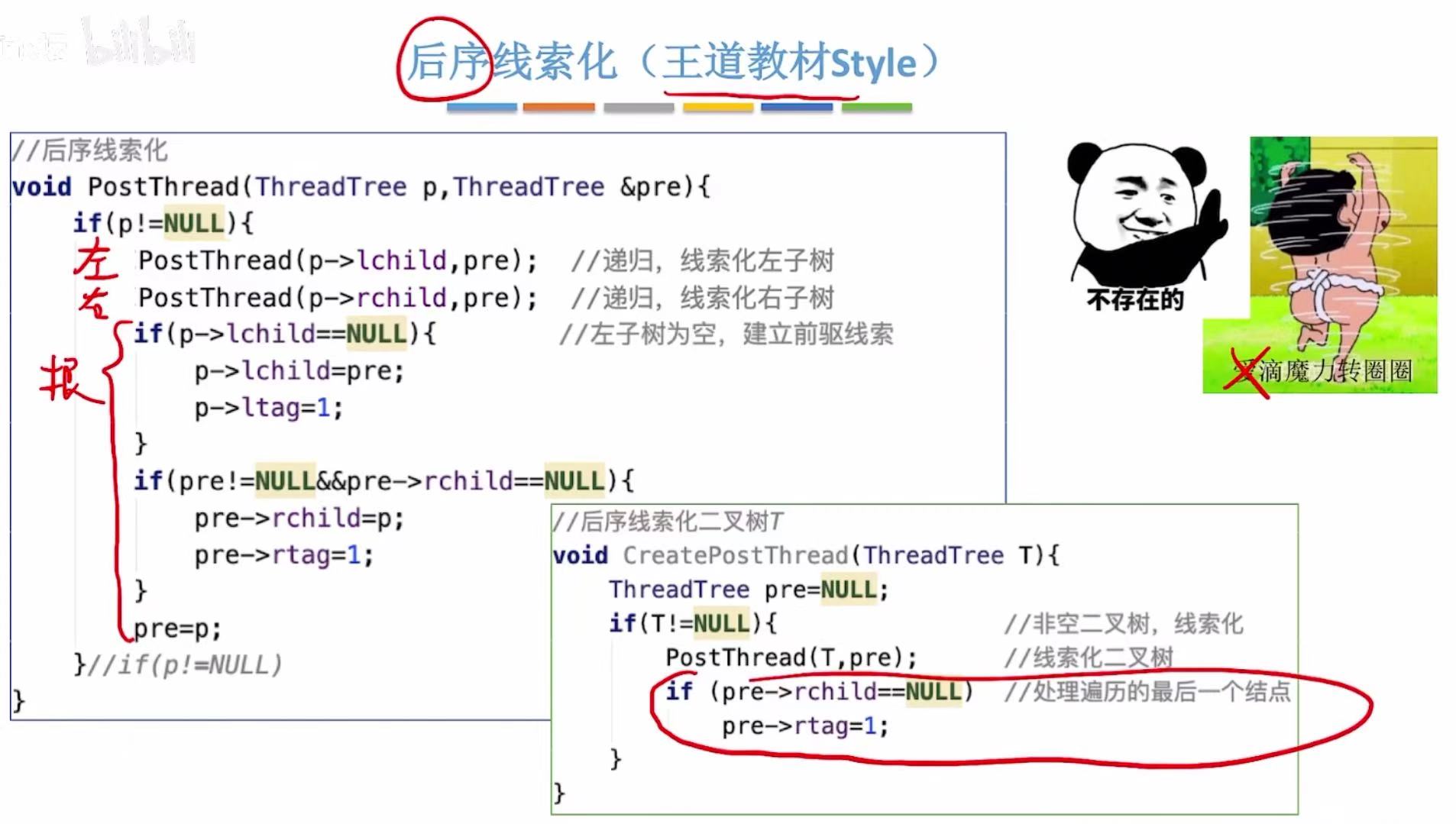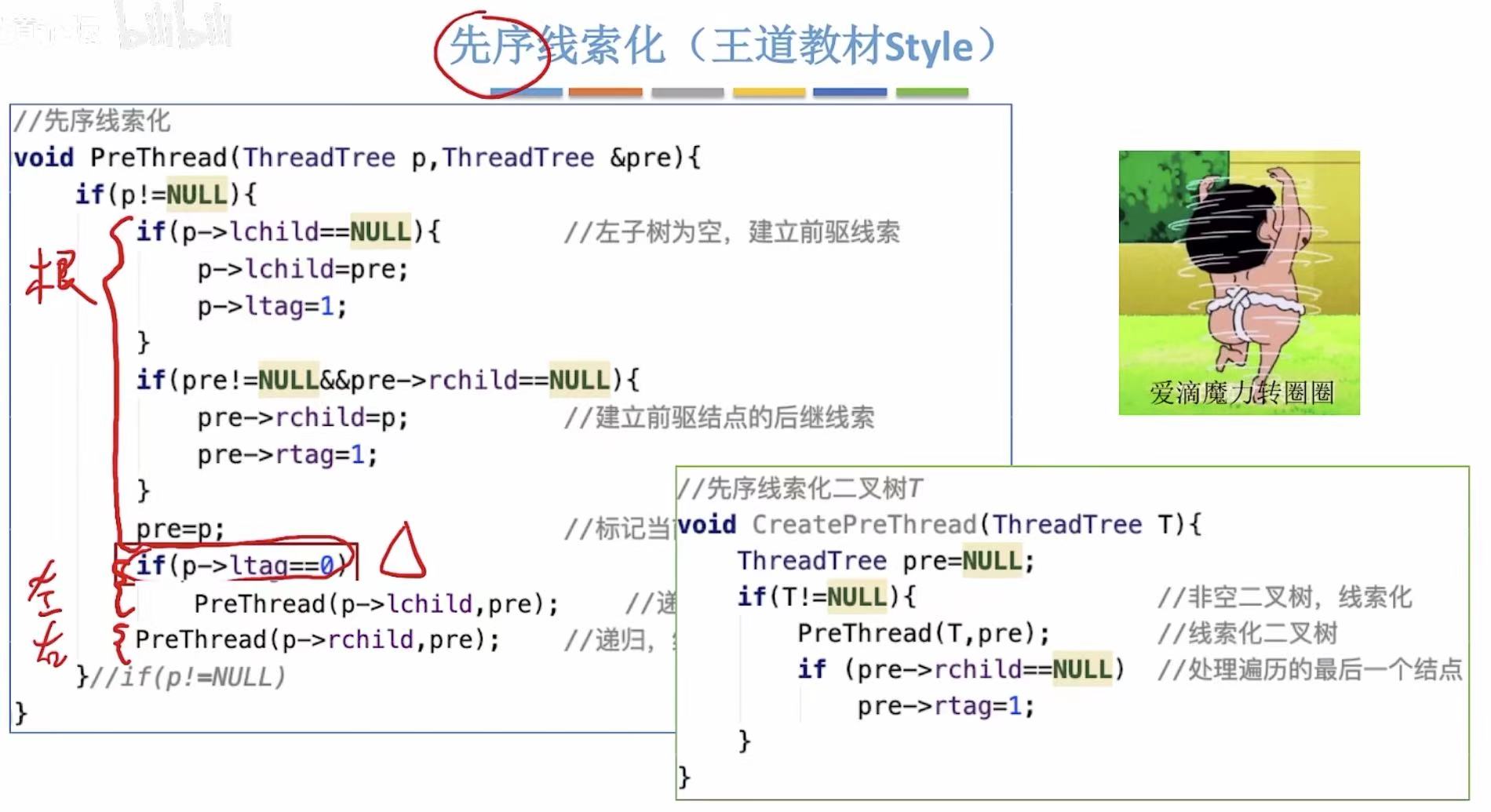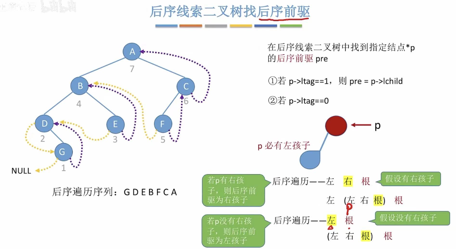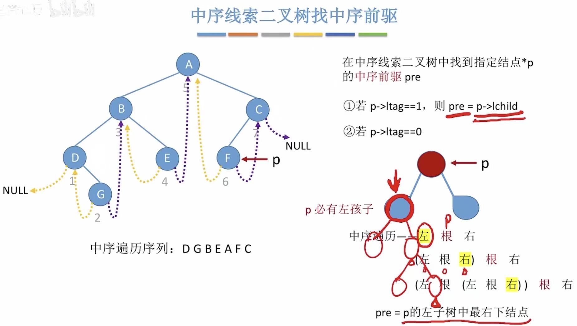 visit(T):当pre指向B,也就是q指向D且将D结点线索化的时候(D的左侧指针指向B)PreThread(T->lchild):需要继续对D的左孩子进行处理- 这里会误将B认为D的左孩子(因为上一步线索化让这两个结点连在了一起)