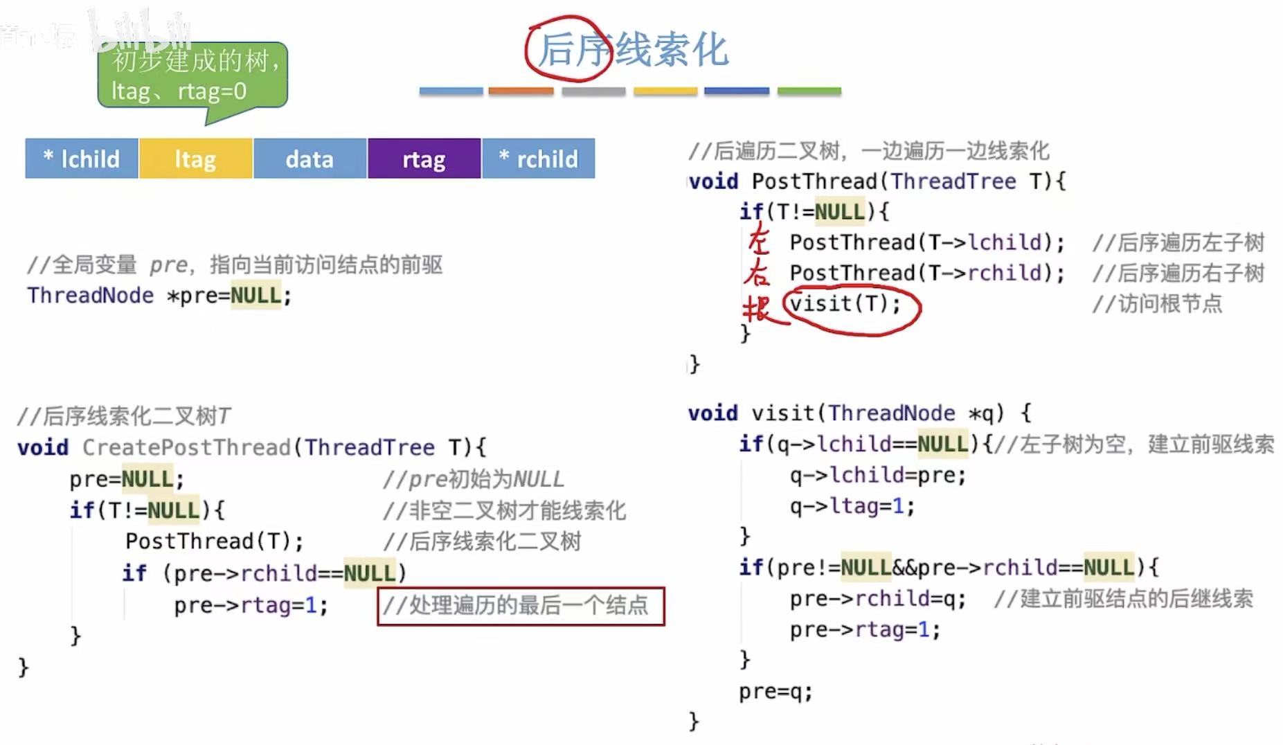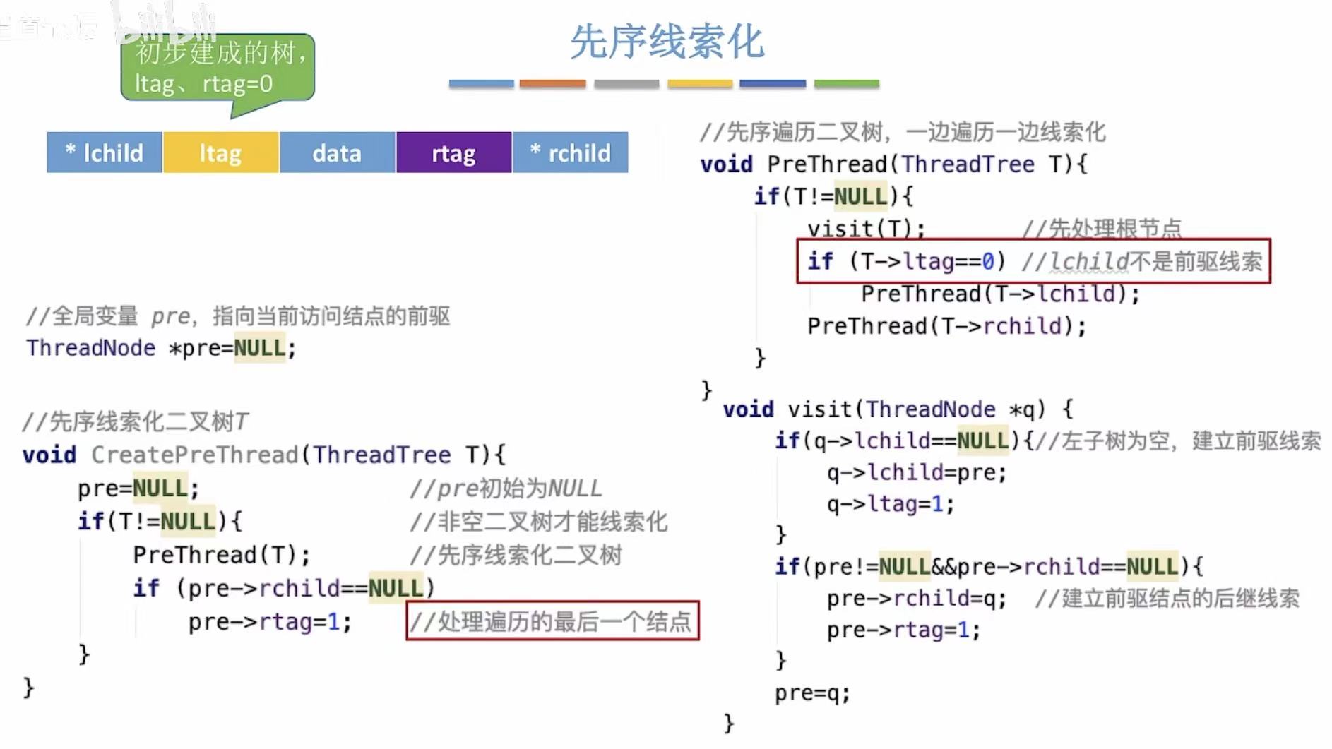 pre->rtag = 1; // 将其右指针设为线索,指向后继(无后继,但可标记)