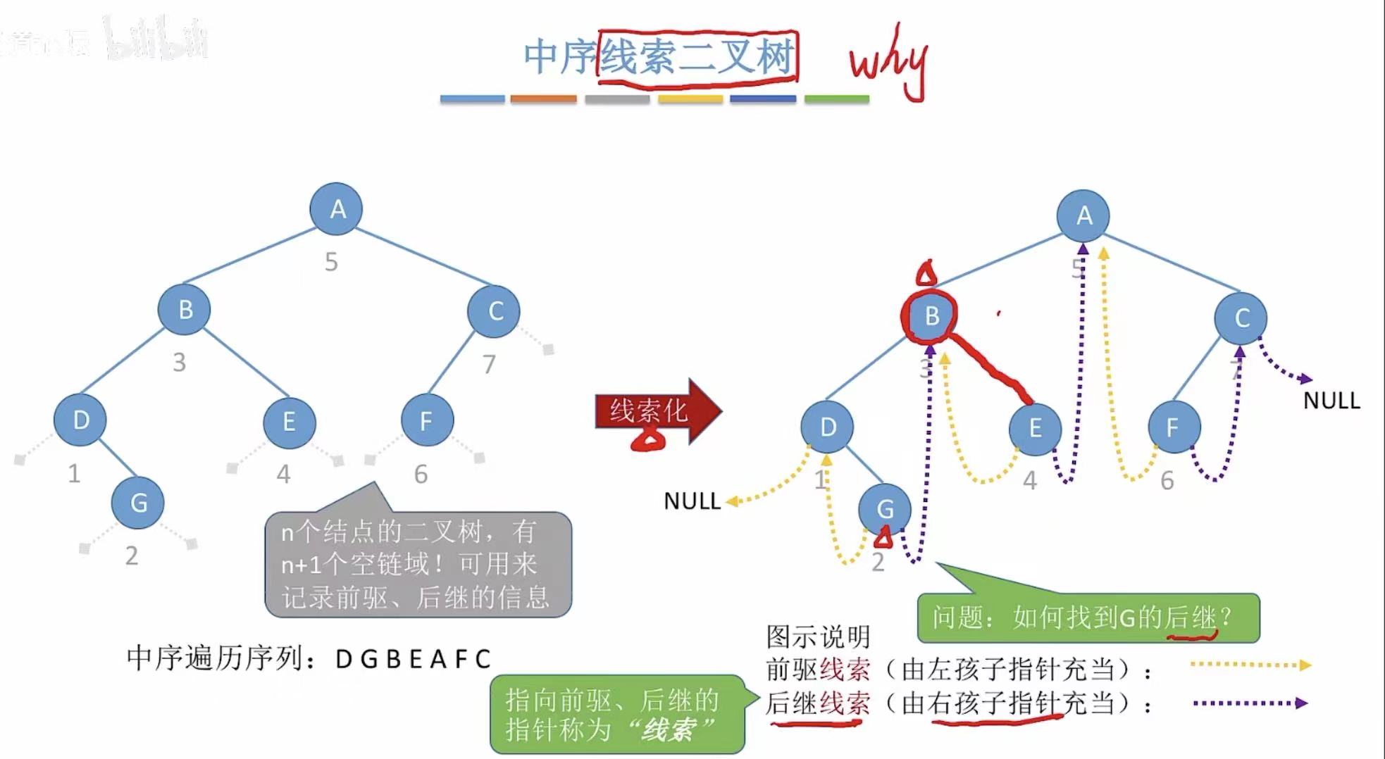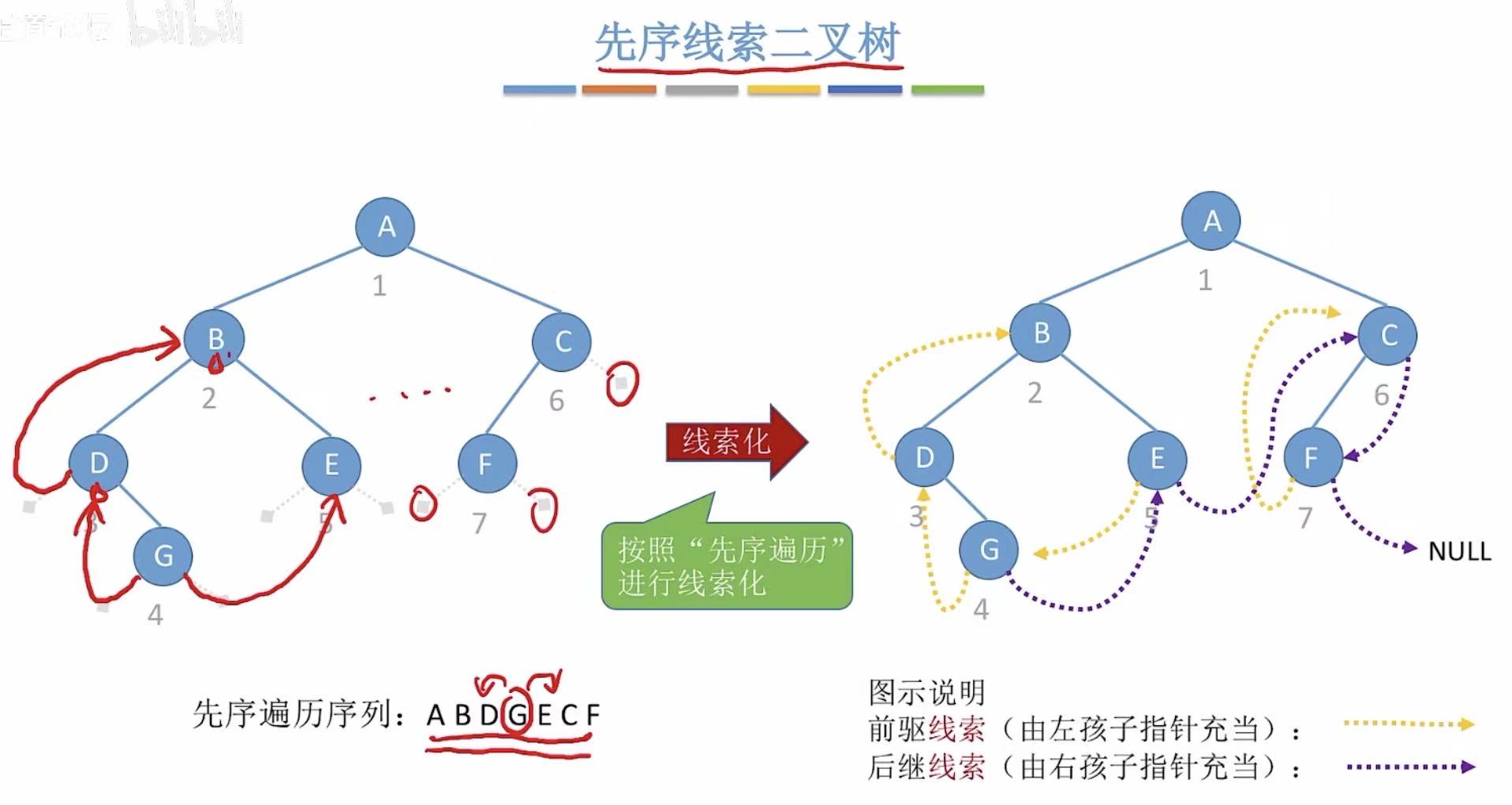 没有左孩子或者右孩子的结点,就可以将左右这两个位置指向自己的前驱或者后继,指向的指针就被叫做线索 。