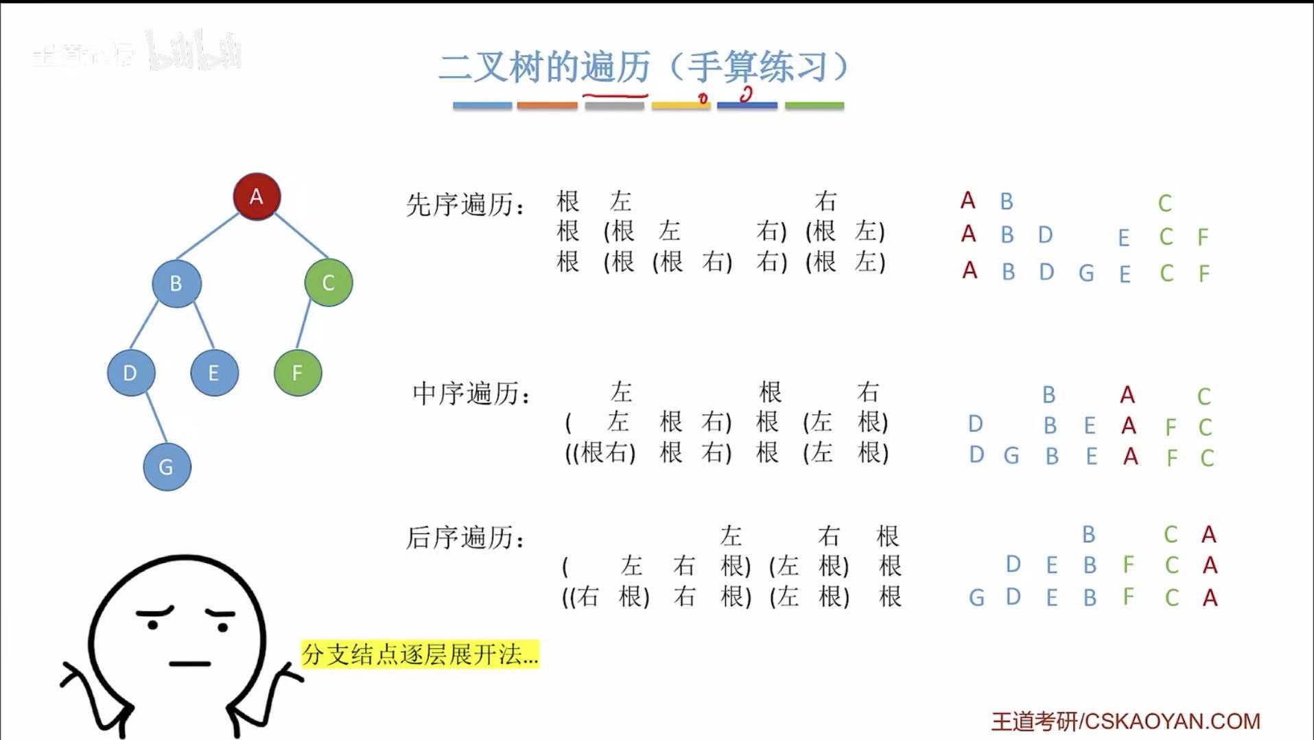 - 第二层+第三层:根左右-->B:BDE;C:CF