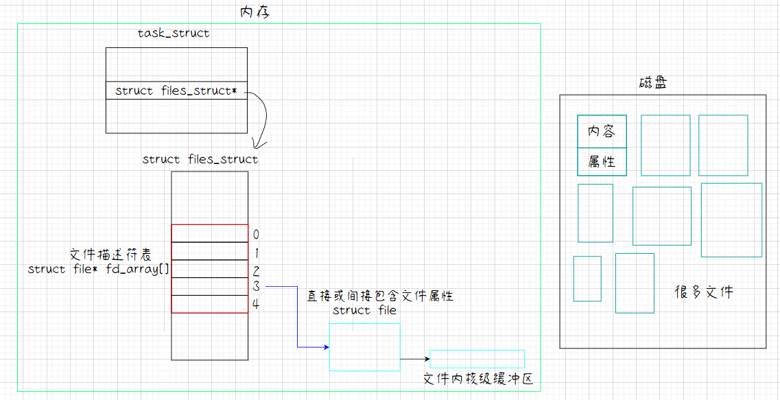 如上图,如果你打开一个文件,在进程PCB中的文件描述表里就会找一个文件描述符给这个被打开的文件,这个struct file的结构体里直接或间接的包含被打开文件的属性,其中重要的是有一个文件内核级缓冲区。