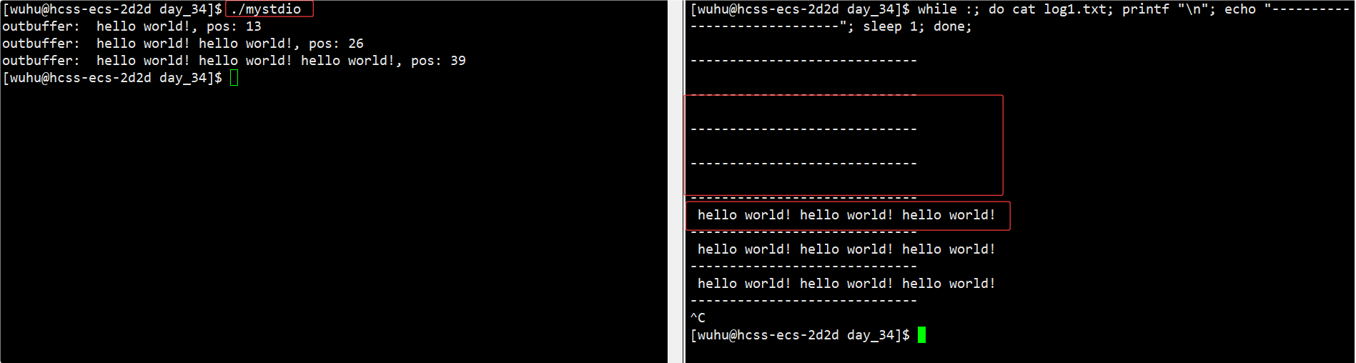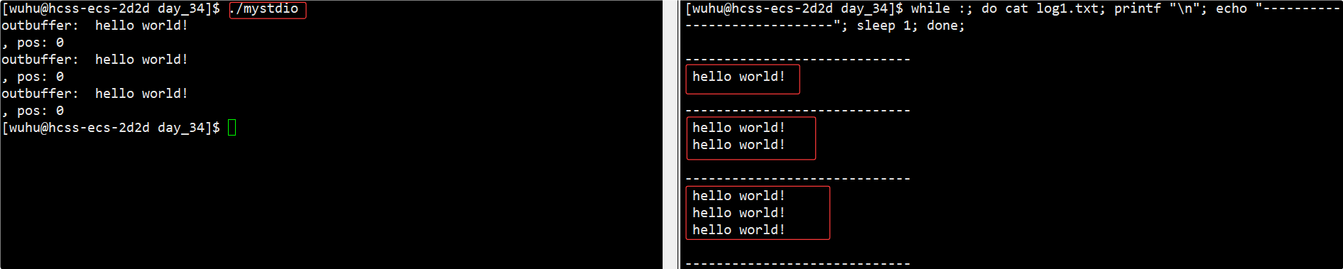 如上,我们再右边每隔一秒观测一次这个文件,结果果然是运行的前三秒文件中没有内容,等到程序结束时,fclose强制刷新缓冲区后文件中才有内容。