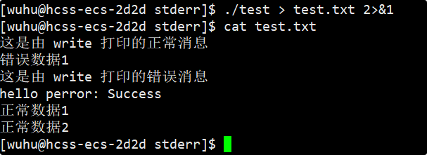而如果你想要合并输出和错误到同一文件,你就执行./test > test.txt 2>&1 ,这条命令是先重定向stdout,再让stderr跟随,其中2>&1是让stderr指向stdout当前指向的地方,也就是让文件描述符2指向的也是test.txt文件了,这样信息就打印到同一个文件中了。