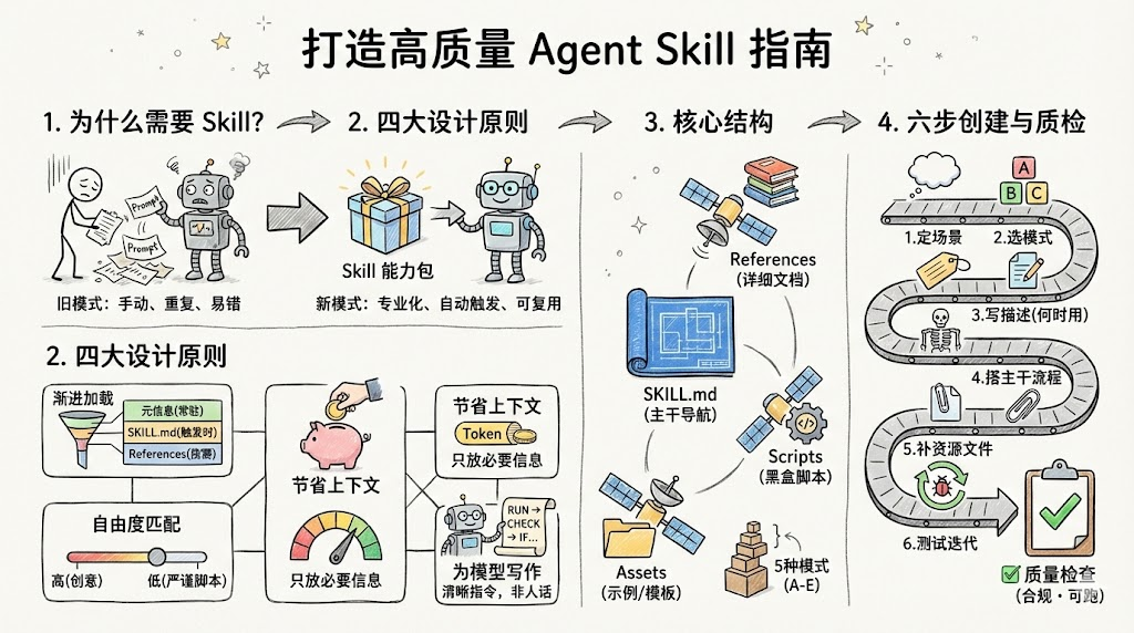 设计高质量的 Skill 需要遵循四个核心原则。这些原则源自 Anthropic 官方最佳实践,能够确保 Skill 既高效又易用。
