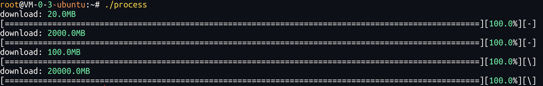 如果去掉这行,进度条会等到循环结束(100%)才一次性输出,因为printf的行缓冲特性(没遇到\n不会刷新).这是进度条能 "实时更新" 的核心.我们一起来看一下下面的例子.