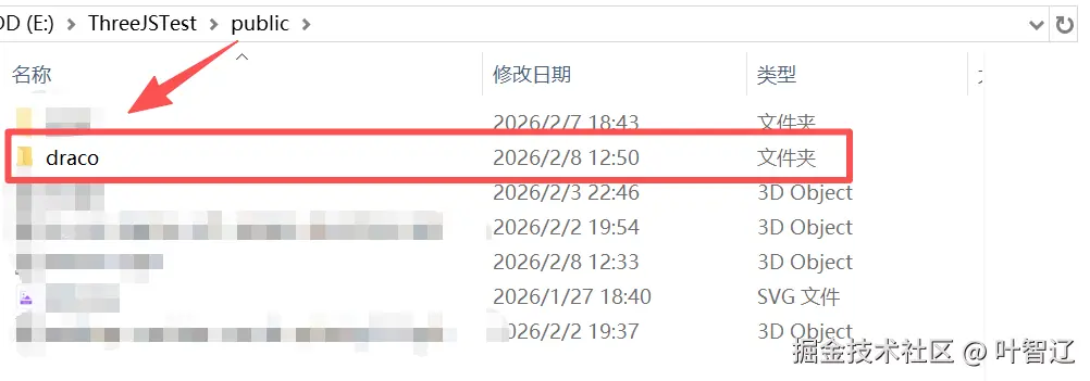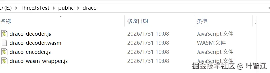 注意 :setDecoderPath 指向的是 Draco 的 WASM 解码文件,需要从 Three.js 的 examples/jsm/libs/draco/ 目录复制到你的 public 文件夹,或者用 CDN(上面示例用的是从threejs复制的本地解码文件)。
