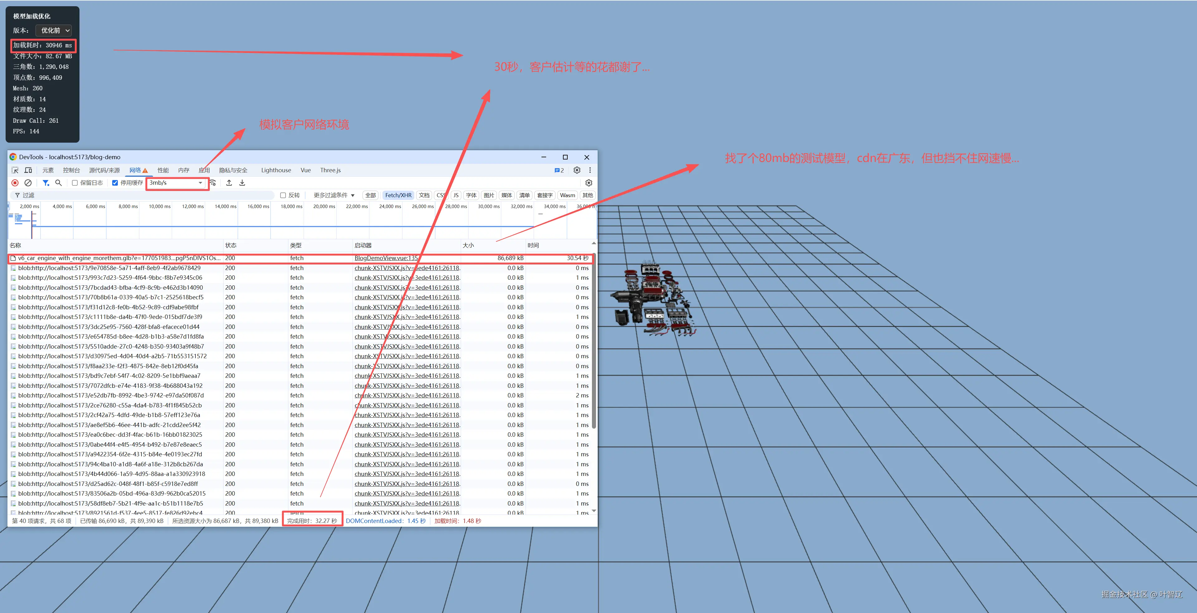 前言:正当我沉浸在将draw call从52000优化到1的喜悦中无法自拔时,产品经理这时候又杀过来了:"客户说模型加载要30秒,还没进去就关页面了,你优化一下?"我打开Network面板一看,卧槽,86MB的GLB文件!这谁顶得住啊...