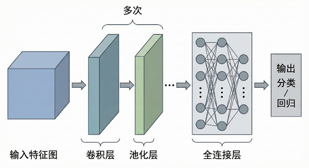 总结来说,卷积神经网络通常以特征图 作为输入,经过多次卷积层与池化层 的组合逐步提取特征,再通过全连接层对提取到的特征进行综合,输出最终的分类或回归结果。