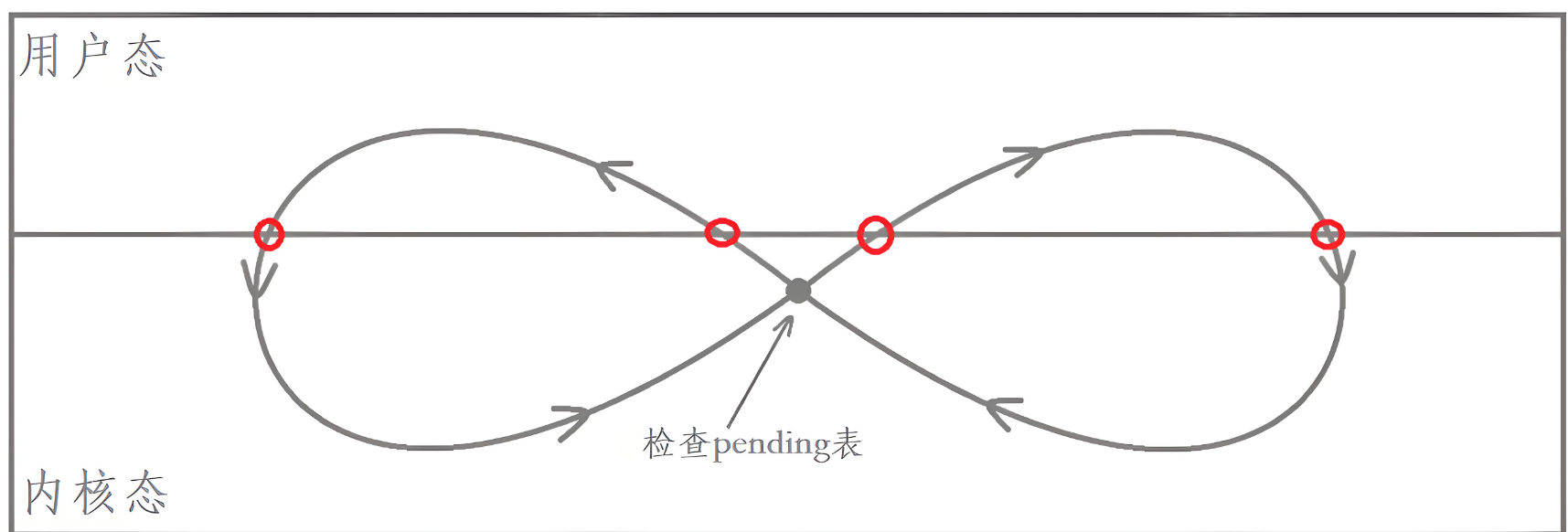 整个流程就变成了一个'无穷'符号,其中交点就是从内核态即将返回用户态时所进行的信号检查。这也就是信号所谓合适的执行时机。