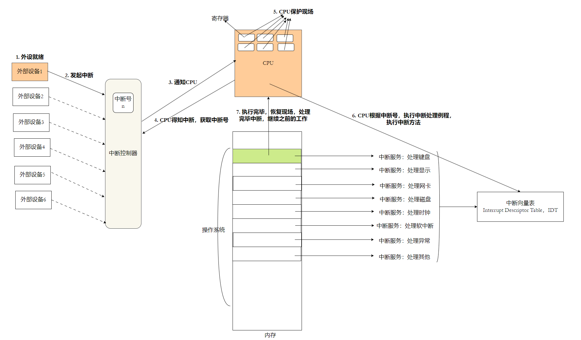 比如:我们进行键盘操作产生数据,此时键盘就会向中断控制器发送一个中断请求(IRQ) ,中断控制器将其映射为对应的中断号(比如是 0),随后中断控制器通过针脚向CPU发送电信号,CPU收到信号就会中断系统进程,获取中断号,然后拿着中断号在中断向量表(一个函数指针数组,其中记录了不同中断信号的中断执行函数)中找到对应的执行方法进行函数调用。