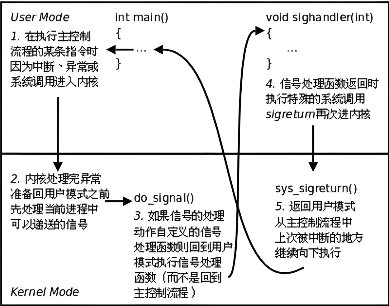 - 内核态→用户态 :内核准备返回前检测到待处理信号,修改进程执行上下文(指向信号处理函数),切回用户态执行自定义信号处理函数;