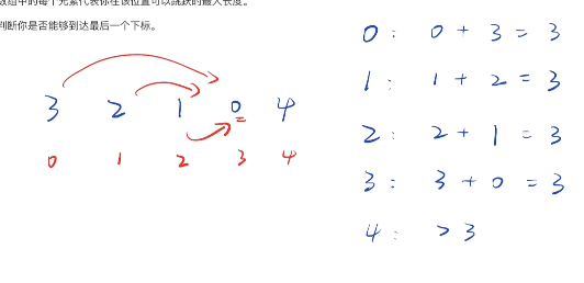 这道题问的是"能不能到达最后一个下标"。 我们可以转换一下思维:我不关心具体怎么跳,我只关心我在当前位置,最远能覆盖到哪里。