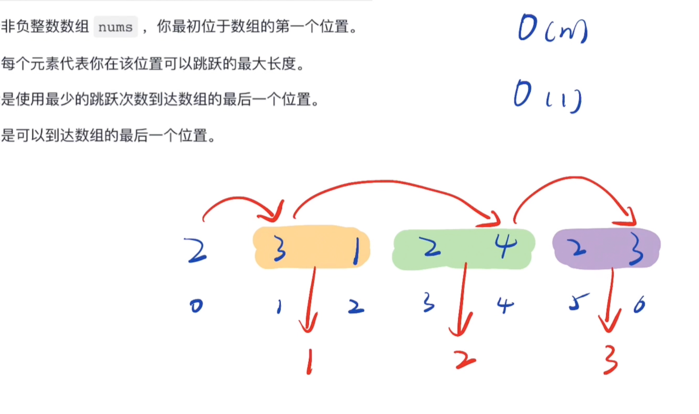 // 思路: 在当前我能到达的所有位置中,我总是去寻找那个能帮我跳得最远的位置,作为我的下一次起跳点。(贪心)