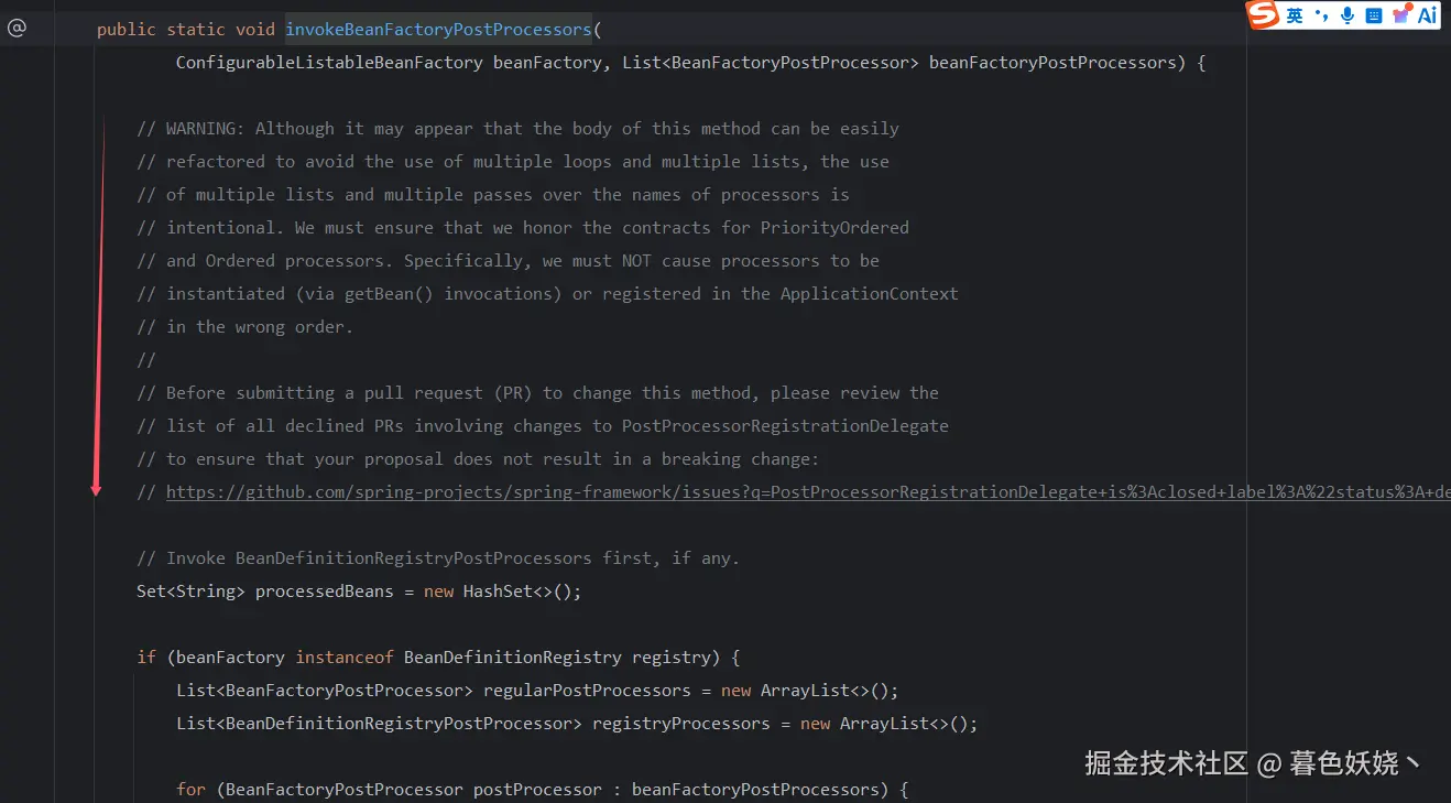 这个方法非常有意思,作者在这里给出了一大段的注释,告诉读者不要再去 Github 提 issue 了,因为这个方法的代码看起来很乱、有很多重复代码,很多读者提了 issue 表明这个方法需要优化,但是作者一一拒绝,回应说这种实现是必要的,一定要确保工厂后置处理器的执行顺序。有兴趣可以查阅上述方法的源码