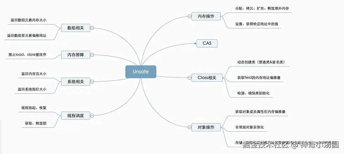如上图所示,Unsafe提供的API大致可分为内存操作、CAS、Class相关、对象操作、线程调度、系统信息获取、内存屏障、数组操作等几类,下面将对其相关方法和应用场景进行详细介绍。