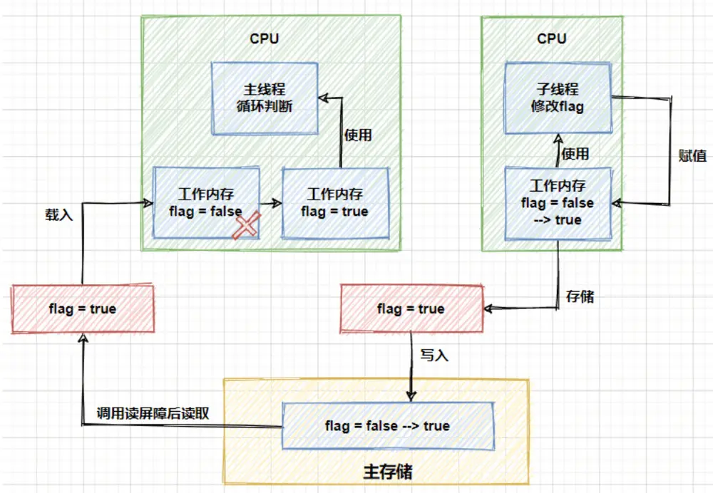看到这估计很多小伙伴们会想到volatile关键字了,如果在字段上添加了volatile关键字,就能够实现字段在多线程下的可见性。基于读内存屏障,我们也能实现相同的功能。下面定义一个线程方法,在线程中去修改flag标志位,注意这里的flag是没有被volatile修饰的: