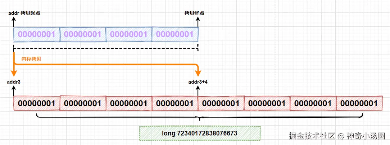 拷贝完成后,使用getLong方法一次性读取 8 个字节,得到long类型的值为 72340172838076673。
