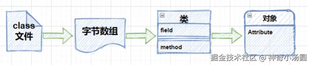 在上面的代码中,首先读取了一个class文件并通过文件流将它转化为字节数组,之后使用defineClass方法动态的创建了一个类,并在后续完成了它的实例化工作,流程如下图所示,并且通过这种方式创建的类,会跳过 JVM 的所有安全检查。