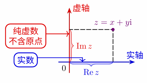 z = x + y i { 实数 ( y = 0 ) 虚数 ( y ≠ 0 ) { 纯虚数 ( x = 0 , y ≠ 0 ) 非纯虚数 ( x ≠ 0 , y ≠ 0 ) z = x + yi \begin{cases} \text{实数 } (y = 0) \\[6pt] \text{虚数 } (y \neq 0) \begin{cases} \text{纯虚数 } (x = 0, y \neq 0) \\[4pt] \text{非纯虚数 } (x \neq 0, y \neq 0) \end{cases} \end{cases} z=x+yi⎩ ⎨ ⎧实数 (y=0)虚数 (y=0){纯虚数 (x=0,y=0)非纯虚数 (x=0,y=0)