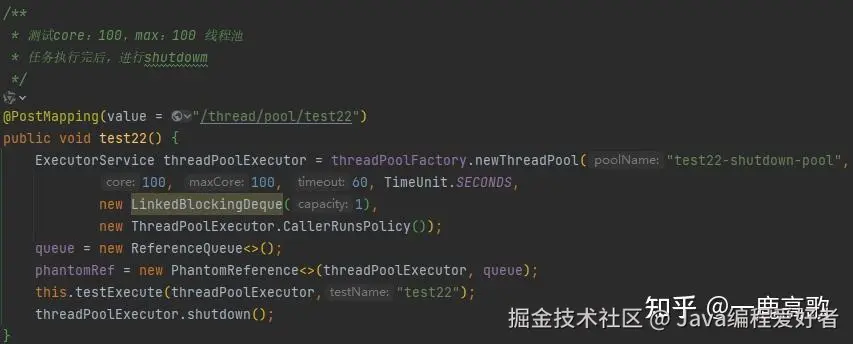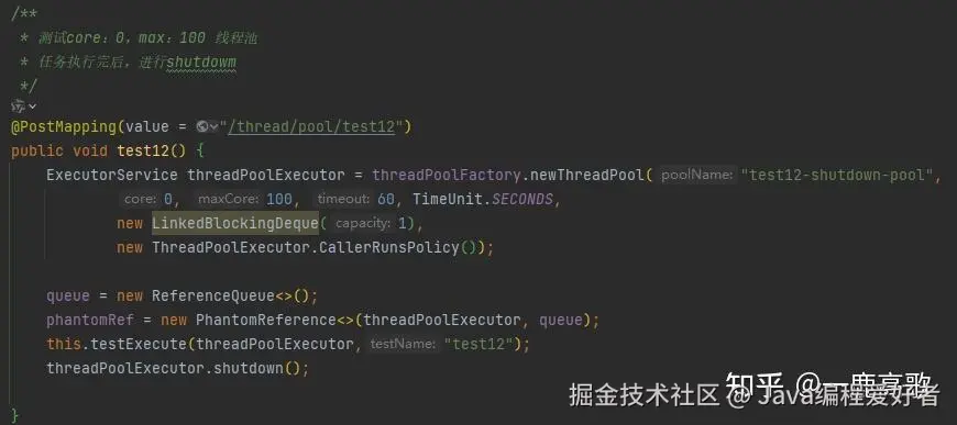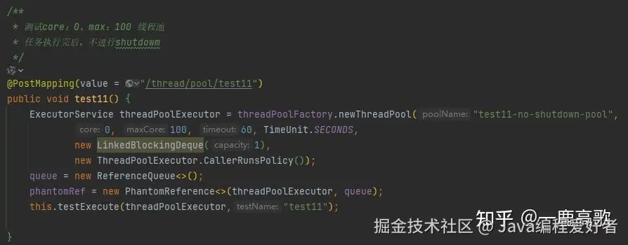 说明:以下代码都是在一个类中,queue、phantomRef这两个对象是作为全局对象,专门捕捉那个"肉身已死但阴魂不散"的线程池对象。