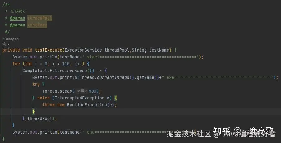 任务数量是110,主要是为了保证有足够多的任务让线程池所有线程能够打满;任务里面要sleep 500ms,也是同样的道理