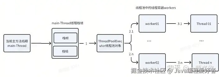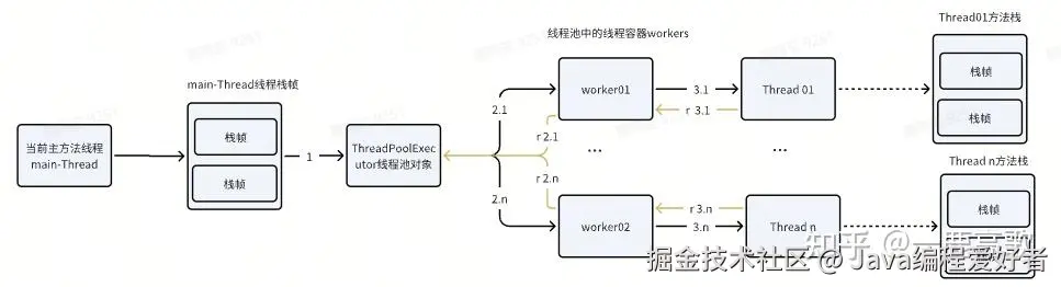 上面的引用关系实际上应该是下面这样的,线程池中的每个线程对象都有自己的执行方法栈对象