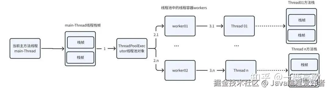 首先我们梳理一下当前执行实验的线程方法栈、线程池、线程池中的线程之间的引用关系图如下: