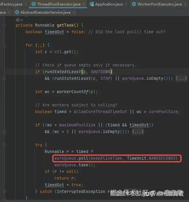 从线程获取任务的源码来看,即使任务队列中是空的,只要线程池状态仍处于Running ,线程会定时从wait状态苏醒,重新获取任务------占用CPU执行分片