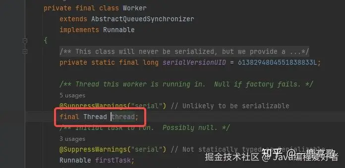 从线程池提交任务开始,从源码中可以看到worker类结构中本身定义有Thread变量属性,在Worker对象创建时,就为Thread属性显式赋值: