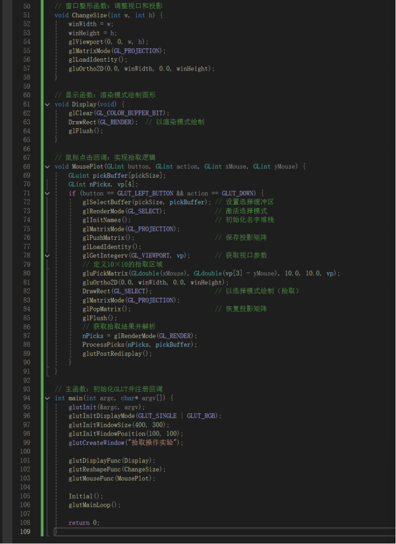 本次实验让我深入理解了 OpenGL 拾取操作的核心机制。选择缓冲区是实现图元拾取的关键,通过 glSelectBuffer 配置缓冲区、glRenderMode(GL_SELECT) 激活选择模式,再结合名字堆栈(glPushName)为图元标记身份,就能精准捕获鼠标点击的图元。解析选择缓冲区时,需明确其数据结构(包含命中数、深度信息、图元名字等),通过指针偏移可提取出选中的图元名字,从而实现交互反馈。整个过程中,投影矩阵的保存与恢复(glPushMatrix/glPopMatrix)、拾取矩阵(gluPickMatrix)的定义也至关重要,它们保证了拾取区域的准确性。通过本次实验,我掌握了图形交互中 "拾取 - 识别 - 反馈" 的完整流程,为开发具备交互功能的复杂图形应用奠定了基础