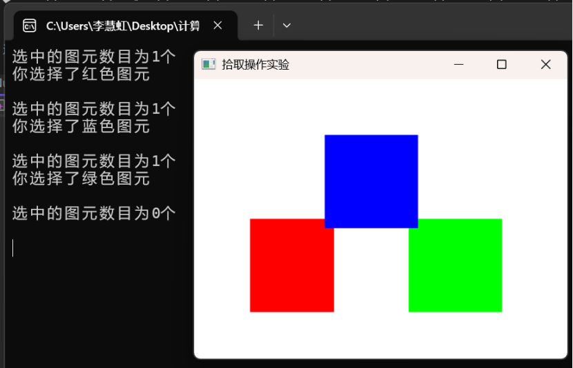 通过 OpenGL 实现图元拾取功能:在窗口中绘制三个不同颜色的矩形(红、绿、蓝),当鼠标左键点击某矩形时,利用选择缓冲区分析拾取结果,并在控制台输出选中的图元信息。