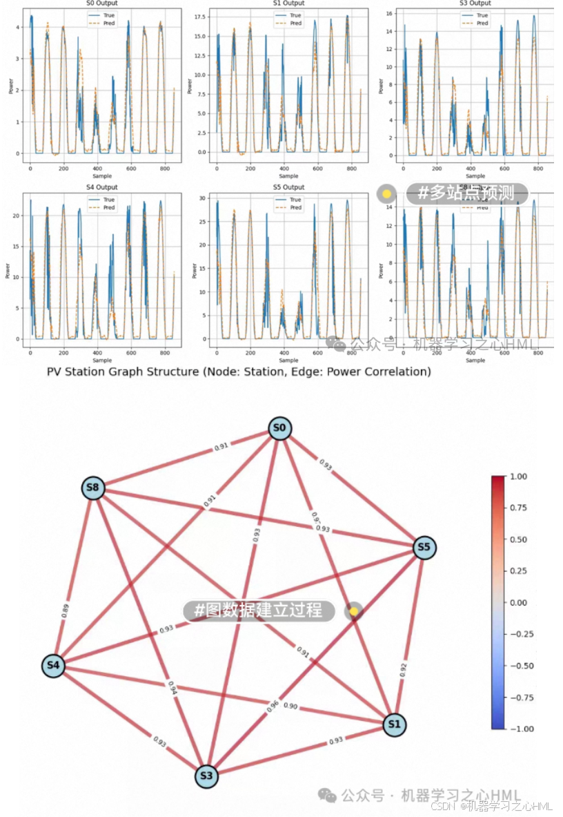 图结构可视化展示了光伏电站网络的拓扑关系。通过节点大小表示电站容量,节点颜色表示预测精度,边粗细表示相关性强度,我们可以直观地看到哪些电站在网络中处于关键位置。