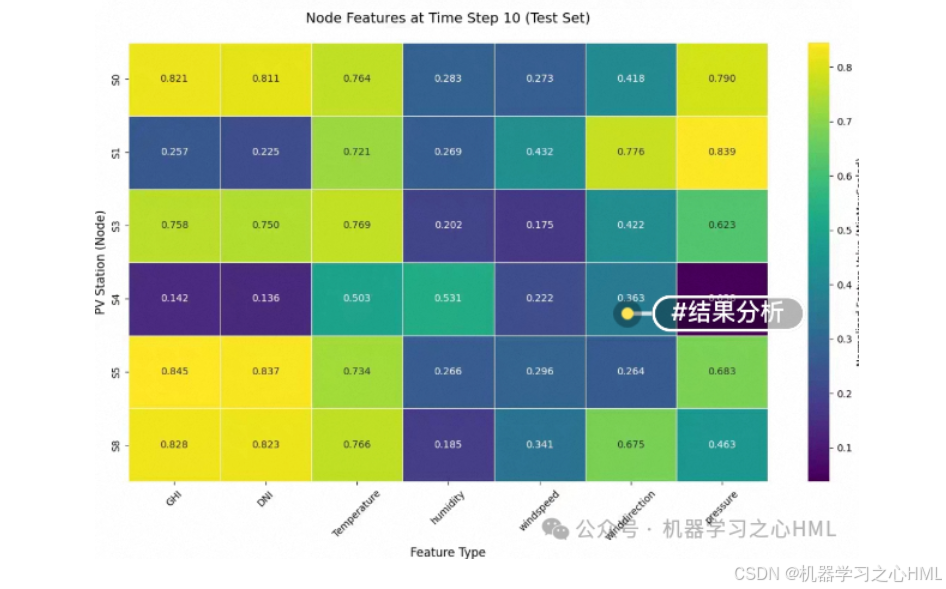 节点特征热力图是另一个强大的分析工具。我们将每个时间步所有电站的特征以热力图形式呈现,可以直观地观察到特征如何在网络中传播和演变。