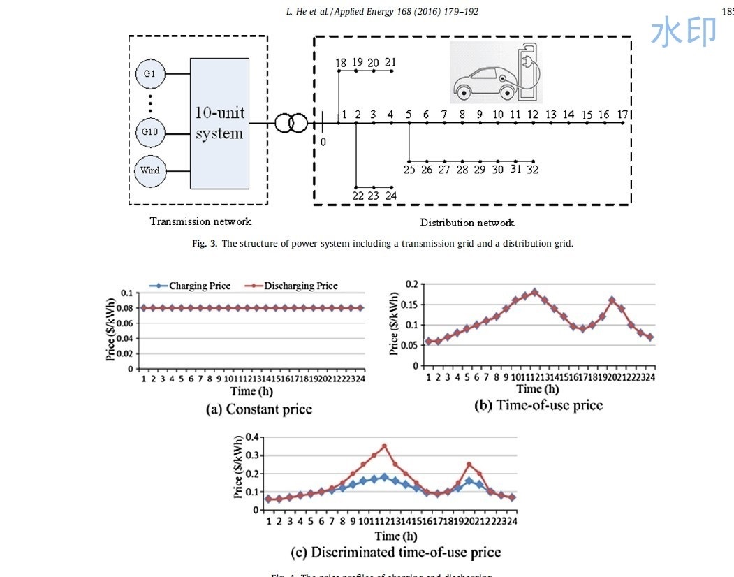 电动汽车时空双层调度 研究了发电机、电动汽车和风力发电的协同优化调度问题。 针对风电存在时电动汽车充放电负荷调度问题,提出了一种新颖的双层输配电系统优化方案。 电网上层优化是将电动汽车与火电机组、基准负荷、风电相结合,在时域内对电动汽车的负荷周期进行优化。 电网底层优化对电动汽车负荷位置进行空间调度。 以10单元输电网和IEEE 33母线配电网为基准,对提出的双层优化策略进行了性能评估。 分析了电价分布、电动汽车普及率和电动汽车负荷位置的影响。 仿真结果表明,所提出的双层优化策略能够适应风电的需求,通过对电动汽车充电和放电进行时间和空间上的调度,提高电网运行的经济性和电动汽车用户的收益。 研究结果还表明,电动汽车充放电负荷的位置对配电网规划至关重要。