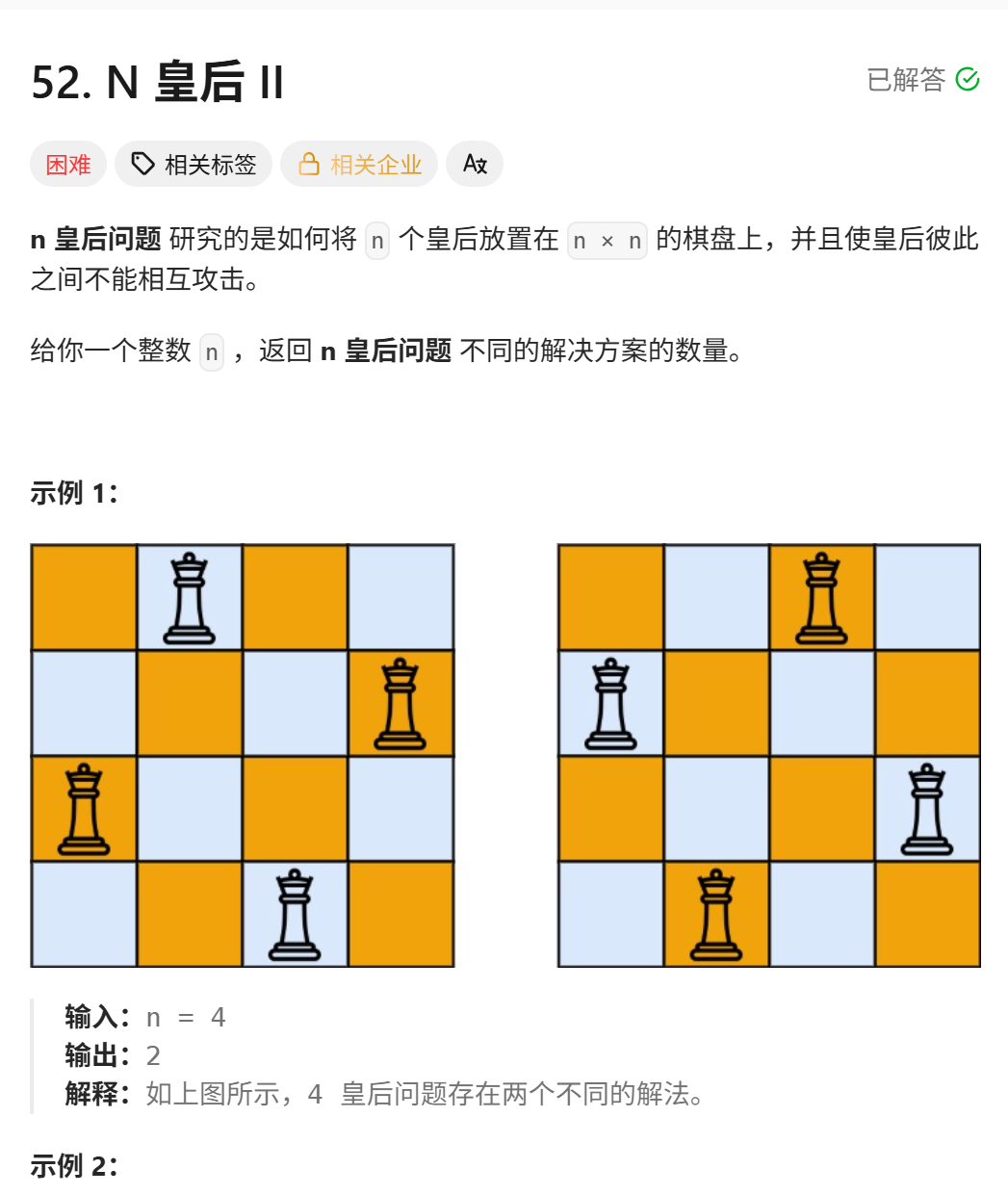 - 皇后顺序不同但位置相同(如先放 (0,0) 再放 (1,1),或先放 (1,1) 再放 (0,0))会被算作两个解