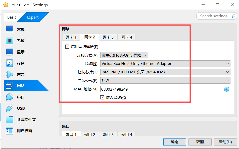 - 网卡2:连接方式 = 仅主机(Host-Only)网络