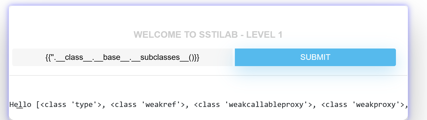Hello [<class 'type'>, <class 'weakref'>, <class 'weakcallableproxy'>, <class 'weakproxy'>, <class 'int'>, <class 'bytearray'>, <class 'bytes'>, <class 'list'>, <class 'NoneType'>, <class 'NotImplementedType'>, <class 'traceback'>, <class 'super'>, <class 'range'>, <class 'dict'>, <class 'dict_keys'>, <class 'dict_values'>, <class 'dict_items'>, <class 'odict_iterator'>, <class 'set'>, <class 'str'>, <class 'slice'>, <class 'staticmethod'>, <class 'complex'>, <class 'float'>, <class 'frozenset'>, <class 'property'>, <class 'managedbuffer'>, <class 'memoryview'>, <class 'tuple'>, <class 'enumerate'>, <class 'reversed'>, <class 'stderrprinter'>, <class 'code'>, <class 'frame'>, <class 'builtin_function_or_method'>, <class 'method'>, <class 'function'>, <class 'mappingproxy'>, <class 'generator'>, <class 'getset_descriptor'>, <class 'wrapper_descriptor'>, <class 'method-wrapper'>, <class 'ellipsis'>, <class 'member_descriptor'>, <class 'types.SimpleNamespace'>, <class 'PyCapsule'>, <class 'longrange_iterator'>, <class 'cell'>, <class 'instancemethod'>, <class 'classmethod_descriptor'>, <class 'method_descriptor'>, <class 'callable_iterator'>, <class 'iterator'>, <class 'coroutine'>, <class 'coroutine_wrapper'>, <class 'EncodingMap'>, <class 'fieldnameiterator'>, <class 'formatteriterator'>, <class 'filter'>, <class 'map'>, <class 'zip'>, <class 'moduledef'>, <class 'module'>, <class 'BaseException'>, <class '_frozen_importlib._ModuleLock'>, <class '_frozen_importlib._DummyModuleLock'>, <class '_frozen_importlib._ModuleLockManager'>, <class '_frozen_importlib._installed_safely'>, <class '_frozen_importlib.ModuleSpec'>, <class '_frozen_importlib.BuiltinImporter'>, <class 'classmethod'>, <class '_frozen_importlib.FrozenImporter'>, <class '_frozen_importlib._ImportLockContext'>, <class '_thread._localdummy'>, <class '_thread._local'>, <class '_thread.lock'>, <class '_thread.RLock'>, <class '_frozen_importlib_external.WindowsRegistryFinder'>, <class '_frozen_importlib_external._LoaderBasics'>, <class '_frozen_importlib_external.FileLoader'>, <class '_frozen_importlib_external._NamespacePath'>, <class '_frozen_importlib_external._NamespaceLoader'>, <class '_frozen_importlib_external.PathFinder'>, <class '_frozen_importlib_external.FileFinder'>, <class '_io._IOBase'>, <class '_io._BytesIOBuffer'>, <class '_io.IncrementalNewlineDecoder'>, <class 'posix.ScandirIterator'>, <class 'posix.DirEntry'>, <class 'zipimport.zipimporter'>, <class 'codecs.Codec'>, <class 'codecs.IncrementalEncoder'>, <class 'codecs.IncrementalDecoder'>, <class 'codecs.StreamReaderWriter'>, <class 'codecs.StreamRecoder'>, <class '_weakrefset._IterationGuard'>, <class '_weakrefset.WeakSet'>, <class 'abc.ABC'>, <class 'collections.abc.Hashable'>, <class 'collections.abc.Awaitable'>, <class 'collections.abc.AsyncIterable'>, <class 'async_generator'>, <class 'collections.abc.Iterable'>, <class 'bytes_iterator'>, <class 'bytearray_iterator'>, <class 'dict_keyiterator'>, <class 'dict_valueiterator'>, <class 'dict_itemiterator'>, <class 'list_iterator'>, <class 'list_reverseiterator'>, <class 'range_iterator'>, <class 'set_iterator'>, <class 'str_iterator'>, <class 'tuple_iterator'>, <class 'collections.abc.Sized'>, <class 'collections.abc.Container'>, <class 'collections.abc.Callable'>, <class 'os._wrap_close'>, <class '_sitebuiltins.Quitter'>, <class '_sitebuiltins._Printer'>, <class '_sitebuiltins._Helper'>, <class 'functools.partial'>, <class 'functools._lru_cache_wrapper'>, <class 'operator.itemgetter'>, <class 'operator.attrgetter'>, <class 'operator.methodcaller'>, <class 'itertools.accumulate'>, <class 'itertools.combinations'>, <class 'itertools.combinations_with_replacement'>, <class 'itertools.cycle'>, <class 'itertools.dropwhile'>, <class 'itertools.takewhile'>, <class 'itertools.islice'>, <class 'itertools.starmap'>, <class 'itertools.chain'>, <class 'itertools.compress'>, <class 'itertools.filterfalse'>, <class 'itertools.count'>, <class 'itertools.zip_longest'>, <class 'itertools.permutations'>, <class 'itertools.product'>, <class 'itertools.repeat'>, <class 'itertools.groupby'>, <class 'itertools._grouper'>, <class 'itertools._tee'>, <class 'itertools._tee_dataobject'>, <class 'reprlib.Repr'>, <class 'collections.deque'>, <class '_collections._deque_iterator'>, <class '_collections._deque_reverse_iterator'>, <class 'collections._Link'>, <class 'types.DynamicClassAttribute'>, <class 'types._GeneratorWrapper'>, <class 'weakref.finalize._Info'>, <class 'weakref.finalize'>, <class 'functools.partialmethod'>, <class 'enum.auto'>, <enum 'Enum'>, <class '_sre.SRE_Pattern'>, <class '_sre.SRE_Match'>, <class '_sre.SRE_Scanner'>, <class 'sre_parse.Pattern'>, <class 'sre_parse.SubPattern'>, <class 'sre_parse.Tokenizer'>, <class 're.Scanner'>, <class 'string.Template'>, <class 'string.Formatter'>, <class 'contextlib.ContextDecorator'>, typing._TypingBase, typing.Generic, <class 'typing._TypingEmpty'>, <class 'typing._TypingEllipsis'>, typing.Protocol, typing.Generic[+T_co], typing.Generic[+T_co, -T_contra, +V_co], typing.Protocol[+T_co], typing.Generic[~KT, +VT_co], typing.Generic[+T_co, -T_contra], typing.Generic[+CT_co], <class 'typing.NamedTuple'>, typing.Generic[~AnyStr], <class 'typing.io'>, <class 'typing.re'>, <class '_ast.AST'>, <class 'markupsafe._MarkupEscapeHelper'>, <class 'warnings.WarningMessage'>, <class 'warnings.catch_warnings'>, <class 'select.poll'>, <class 'select.epoll'>, <class 'selectors.BaseSelector'>, <class 'tokenize.Untokenizer'>, <class 'traceback.FrameSummary'>, <class 'traceback.TracebackException'>, <class 'threading._RLock'>, <class 'threading.Condition'>, <class 'threading.Semaphore'>, <class 'threading.Event'>, <class 'threading.Barrier'>, <class 'threading.Thread'>, <class 'subprocess.CompletedProcess'>, <class 'subprocess.Popen'>, <class '_socket.socket'>, <class 'socketserver.BaseServer'>, <class 'socketserver.ForkingMixIn'>, <class 'socketserver.ThreadingMixIn'>, <class 'socketserver.BaseReque