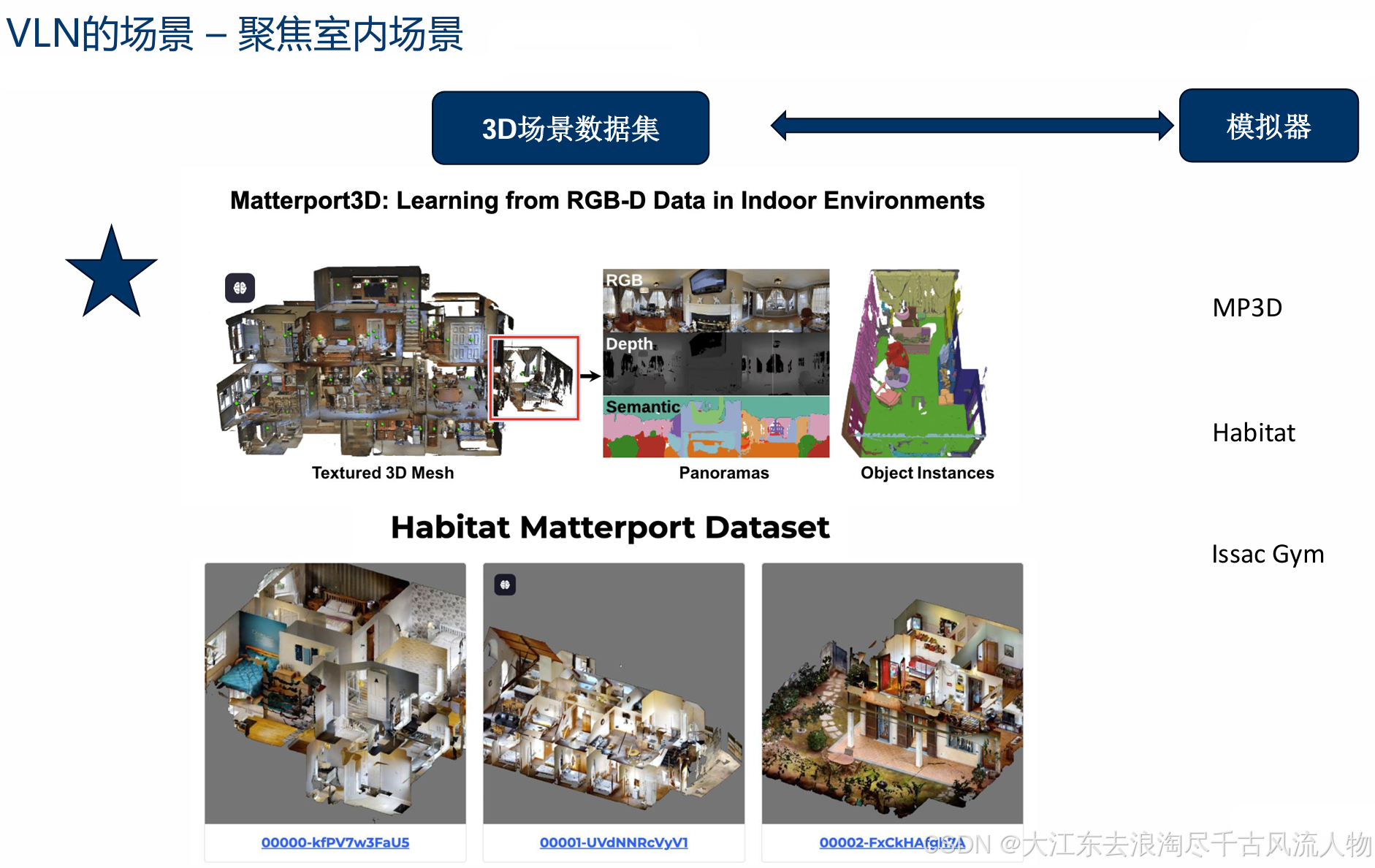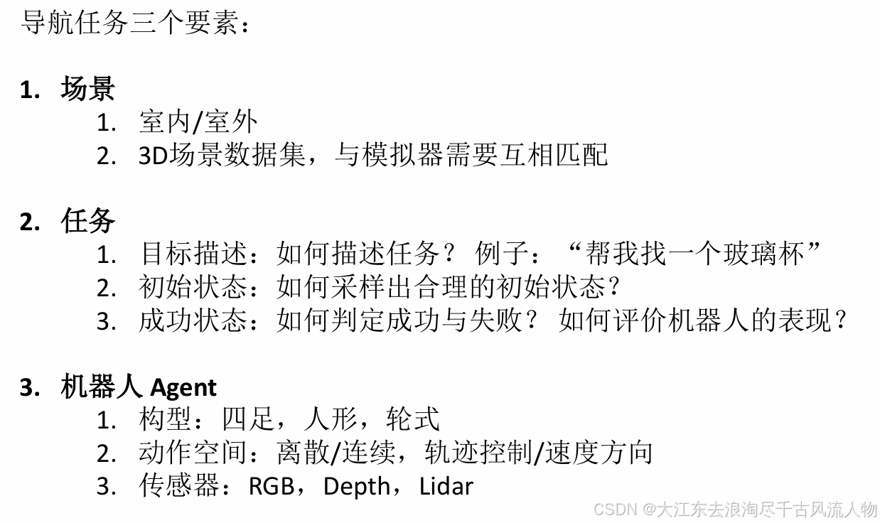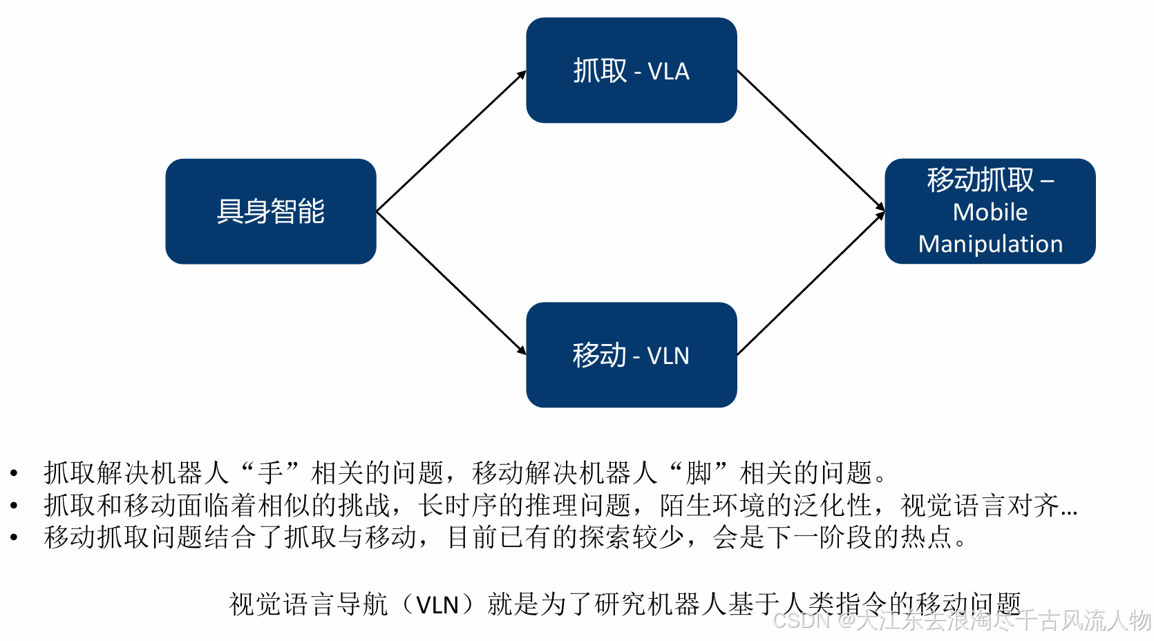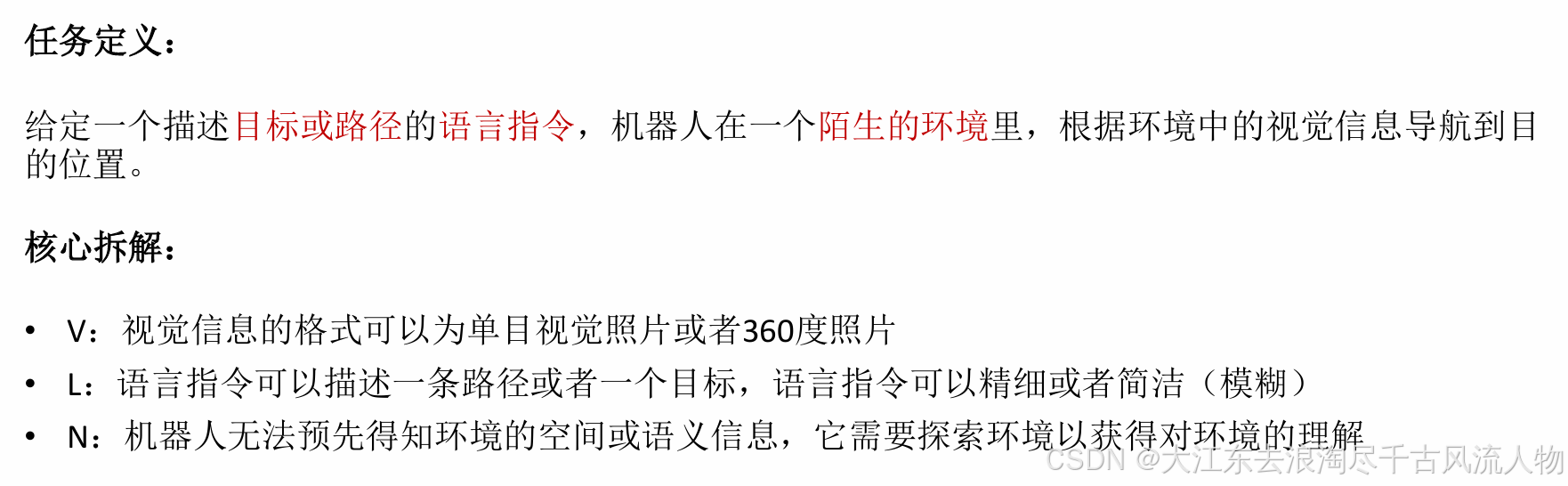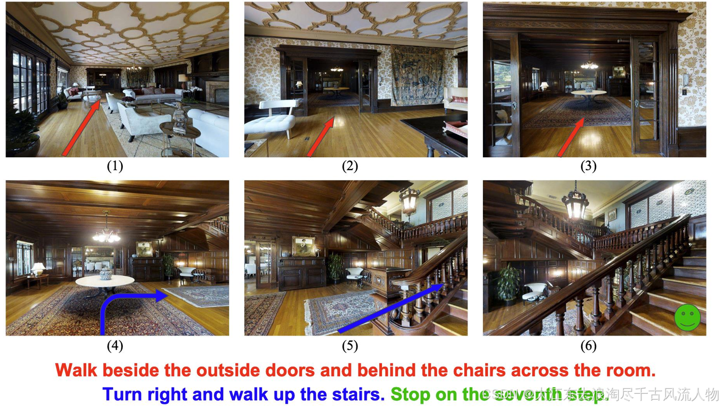 - 多模态 :VLN需要同时处理视觉信号 (环境图像)和语言信号 (导航指令),并建立两者的关联。比如指令"在第三个路口左转",智能体需要识别"路口"的视觉特征,同时理解语言中的"第三个""左转"等语义。